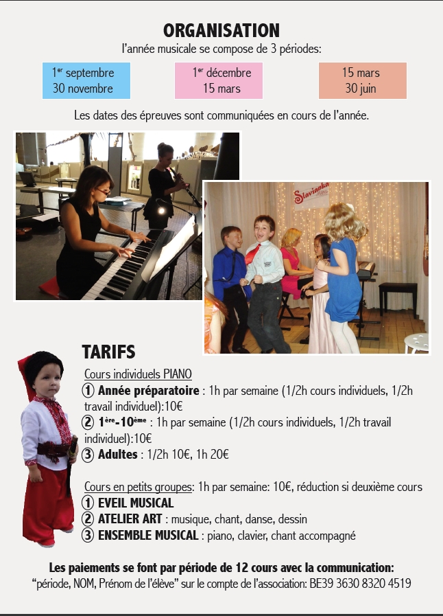 Renseignements par téléphone : 0496 66 29 89 après 18 heures ou courriel : slavianka.art at hotmail dot com Les paiements se font par période de 12 cours avec la communication : période, prénom de l'élève sur le compte de l'association : BE39 3630 8320 4519
