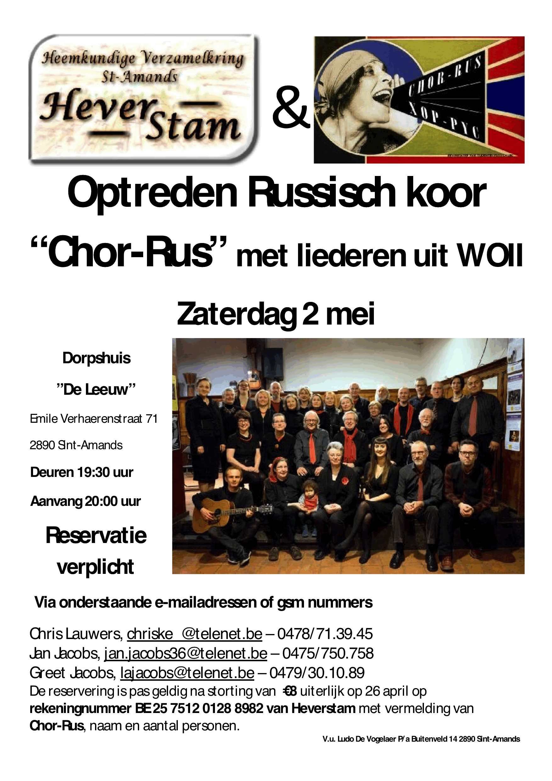 De reservering is pas geldig na storting uiterlijk op 26 april van €8 per persoon op rekeningnummer BE 25 7512 0128 8982 van Heverstam met vermelding van Chor-Rus, naam en het aantal personen.
