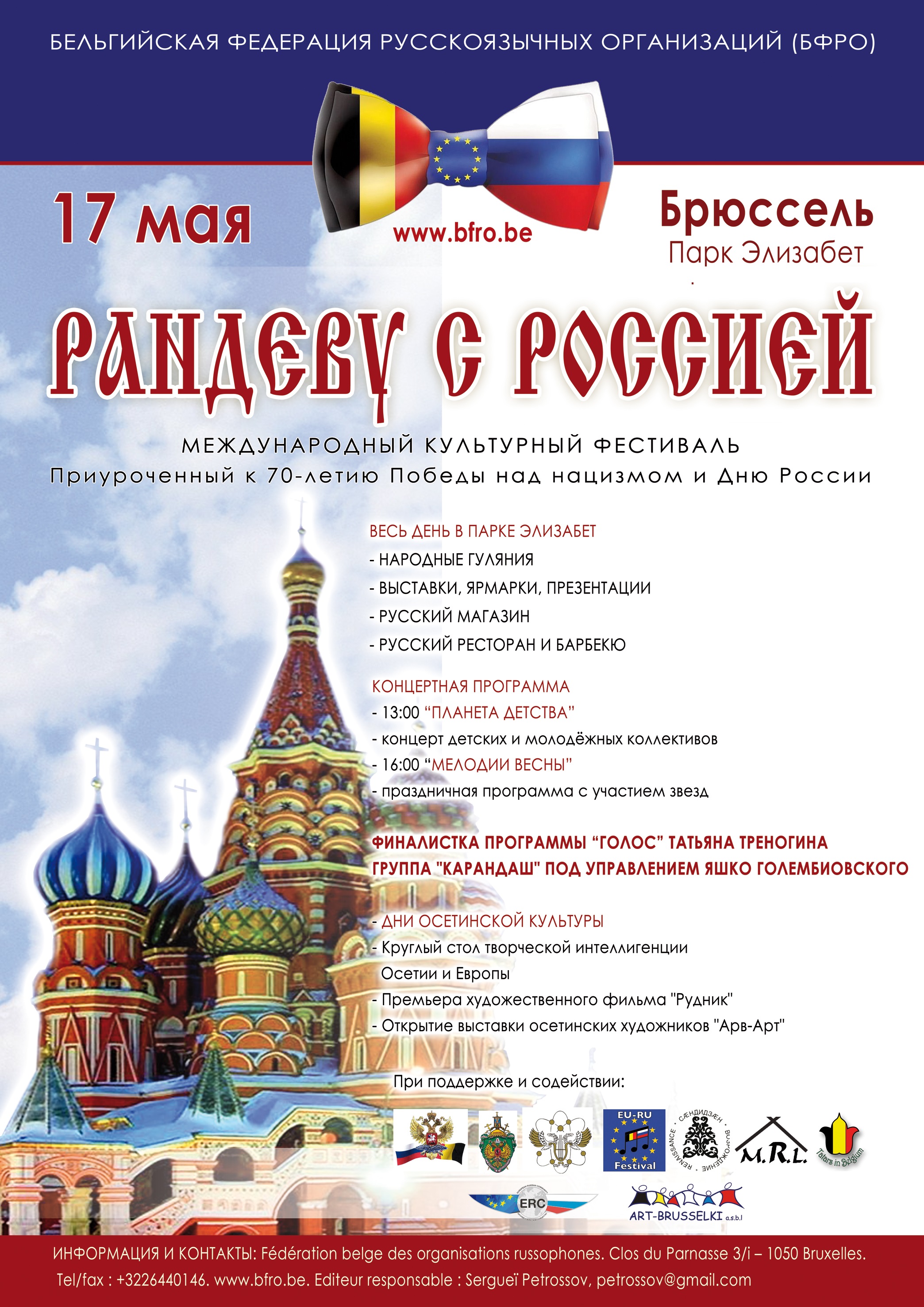 Ce petit agenda de mi-mai pour vous rappeler que ce dimanche 17, le festival « Rendez-vous avec la Russie » se tiendra bien au Parc Elisabeth avec en vedettes Tatiana Trenogina et le groupe de musique russe et tzigane « Karandash ». En ce qui concerne les commémorations qui actuellement se succèdent, à ne pas oublier le « Pélerinage annuel à Mourmelon » organisé le 24 mai au cimetière militaire russe de Saint Hilaire le Grand. C'est dommage qu'il faille ici choisir, car à la même date Nathalie Reingardt présente son nouveau spectacle « Театральный вечер » au Centre Culturel de la Fédération de Russie à Bruxelles. Y seront joués en langue russe des extraits de pièces de Gogol, Pouchkine, Tolstoï et Zagoskine. Signalons enfin que la « Ronde Musicale » nous accueille à sa soirée de bienfaisance le 22 mai à l'Hôtel Aloft « to enjoy the music and help Julia Tokmakova! ». Puis à ne pas perdre de vue le prochain « Circuit culturel dans les Pays Baltes » accompagné par Sacha et Macha Pouchkine fin juillet début août prochain et cet été l'exposition « Les Romanov de Saint-Pétersbourg à Saint-Briac » en Bretagne. Et pour n'oublier personne, nous vous invitons bien évidement à parcourir soigneusement la « LISTE » complète des nombreux événements - excursions, expositions, ventes d'art russe, conférences, séminaires, concerts, assemblées, nouveaux livres - car beaucoup se sont rajoutés au calendrier depuis sa récente diffusion.
