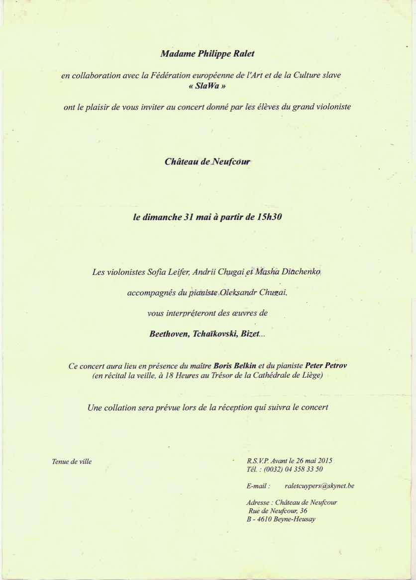 Voici le lien vers la liste des événements - une trentaine déjà - repris pour ce mois de mai 2015. Nous y relevons par exemple : La tournée « Russian legends » du nouveau spectacle de Mikhaylo Markovitch qui s'étale du 14 au 23 mai ;La reprise du festival international « Rendez-vous avec la Russie » au Parc Elisabeth et ce avec la présence cette année du groupe de musique russe et tsigane « Karandash » ;Les prochains concerts « Acoustic de-Tension » d'hôtes milanais organisés à l'hotel Aloft et à la « Ronde Musicale » ;La soirée théâtre proposée par Nathalie Reingardt au Centre Culturel de Russie à Bruxelles. Y seront joués en langue russe des extraits de pièces de Gogol, Pouchkine, Tolstoï et Zagoskine ;Enfin, Lire la suite... car suivent aussi assemblées, concerts, expositions, excursions, folklore et vente d'art. Note : sous la rubrique bibliographie et en lecture => la traduction en russe de l'ouvrage de Marie-Pierre Rey intitulé « L'effroyable tragédie : Une nouvelle histoire de la campagne de Russie » vient de paraître en lanque russe à Moscou sous le titre « Страшная трагедия. Новый взгляд на 1812 год » aux éditions Российская политическая энциклопедия.