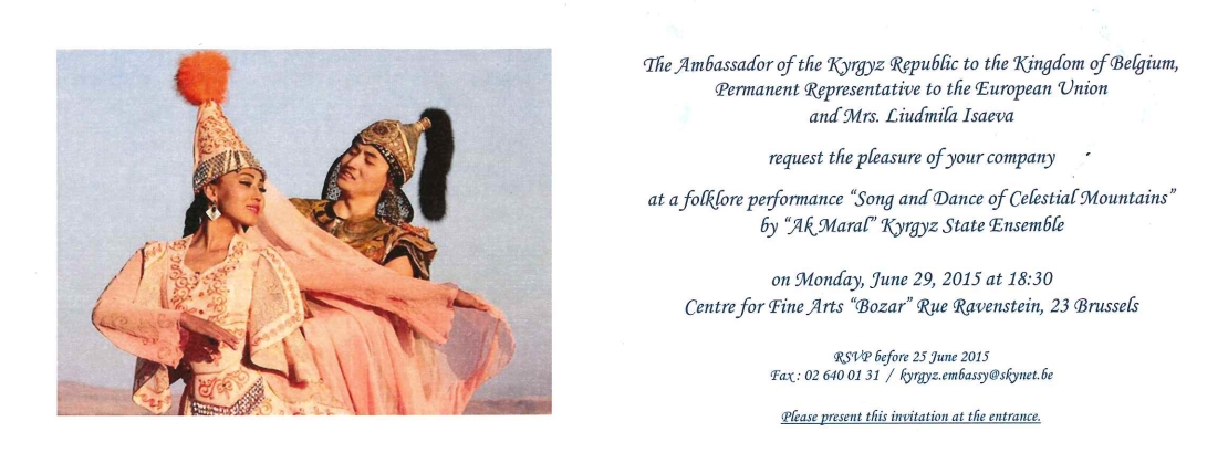 « Ak Maral » Kyrgyz State Ensemble The Ambassador of the Kyrgyz Republic to the Kingdom of Belgium, Permanent representative to the European Union and Mrs. Liudmila Isaeva request the pleasure of your company at the folklore performance « Song and Dance of Celestial Mountains » by « Ak Maral » Kyrgyz State Ensemble.