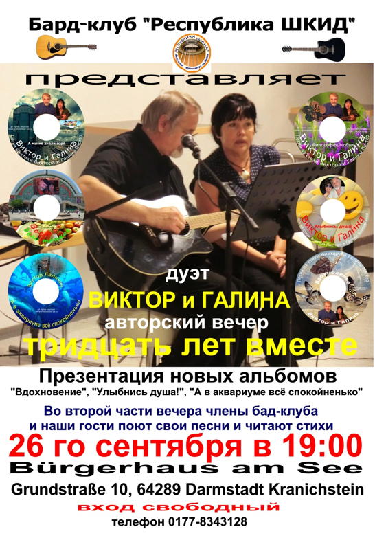Авторский вечер тридцать лет вместе. 26-го сентября, в Кранихштайне (Darmstadt), в 19:00, будет авторский вечер дуэта ВИКТОР и ГАЛИНА « Тридцать лет вместе ». Будет много новых песен. Во второй половине вечера члены нашего клуба и наши гости будут петь свои песни и читать стихи. Ждём всех наших друзей, а также всех, кто любит авторкую песню и русскую поэзию. Виктор и Галина