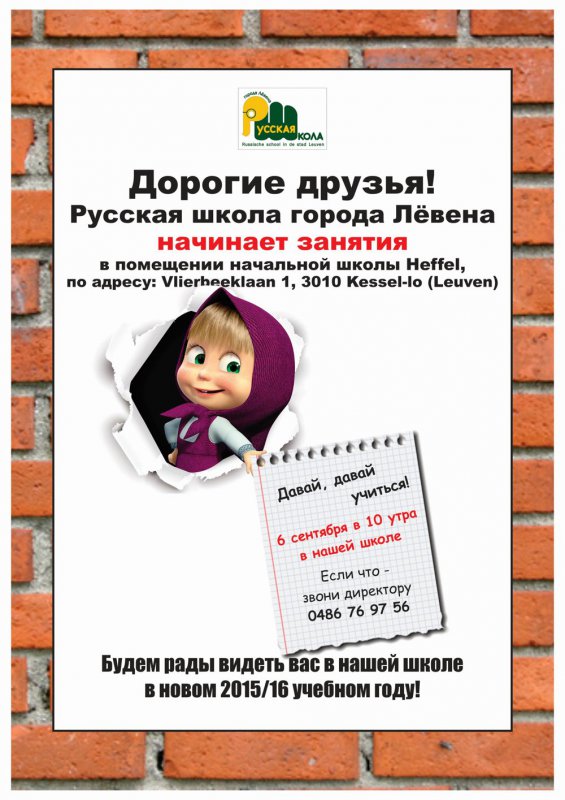 Русская школа города Лёвена начинает занятия в помещении начальной школы Heffel (Kessel-lo). Будем рады видеть Вас в нашей школе в новом 2015-16 учебном году.