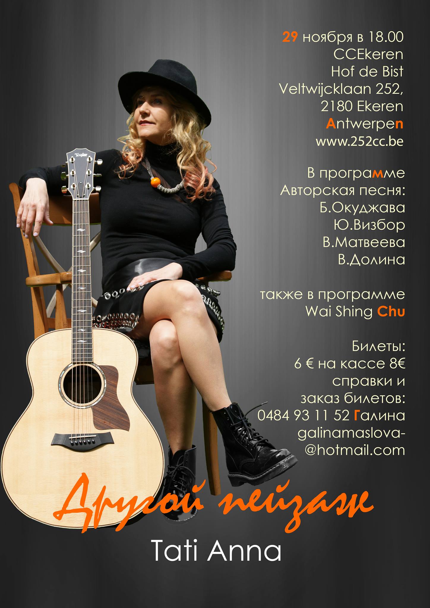 Билеты: 6 € на кассе 8€ Справки и заказ билетов : 0484 93 11 52 Галина Courriel : galinamaslova at hotmail dot com Номер счёта : BE76 4145 1823 8195
