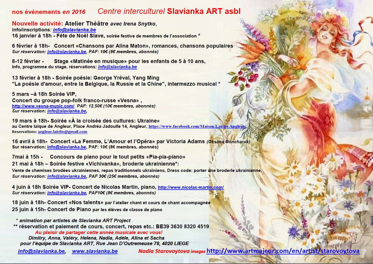 Nos événements en 2016 Centre interculturel Slavianka ART asbl Nouvelle activité : Atelier Théâtre avec Irena Snytko ; 16 janvier à 18h - Fête de Noël Slave, soirée festive des membres de l’association ; 6 février à 18h - Concert « Chansons par Alina Maton », romances, chansons populaires. Sur réservation : PAF 10€ (8€ membres, abonnés) ; 8-12 février - Stage « Matinée en musique », pour les enfants de 5 à 10 ans. Programme du stage ; 13 février à 18h - Soirée poésie. George Yréval, et Yang Ming « La poésie d'amour, entre la Belgique, la Russie et la Chine », intermezzo musical* ; 5 mars –à 18h Soirée VIP, Concert du groupe pop-folk franco-russe « Vesna », Sur réservation : PAF 12.50€ (10€ membres, abonnés) ; 19 mars à 18h- Soirée « À la croisée des cultures : Ukraine », au Centre laïque d'Angleur, place Andréa Jadoulle 14, Angleur, réservations : angleur.laicite at gmail dot com ; 16 avril à 18h- Concert « La Femme, L’Amour et l’Opéra », par Victoria Adams (Oksana Goncharuk). Sur réservation : iPAF 10€ (8€ membres, abonnés) ; 7 mai à 15h - Concours de piano pour le tout petits « Pia-pia-piano » ; 21 mai à 18h – Soirée festive « Vichivanka », broderie ukrainienne* : Vente de chemises brodées ukrainiennes, repas traditionnels ukrainiens, Dress code : porter une broderie ukrainienne, Sur réservation : PAF 30€ (25€ membres, abonnés) ; 4 juin à 18h Soirée VIP - Concert de Nicolas Martin, piano, http://www.nicolas-martin.com/ Sur réservation : PAF 10€ (8€ membres, abonnés) ; 18 juin à 18h - Concert « Nos talents », par l’atelier chant et cours de chant accompagnée ; 25 juin à 15h - Concert de Piano par les élèves de classe de piano. * animation par artistes de Slavianka ART Project Au plaisir de partager cette année musicale avec vous! Dimitry, Anna, Valéry, Helena, Nadia, Adèle, Alina et Sacha pour l’équipe de Slavianka ART, nka