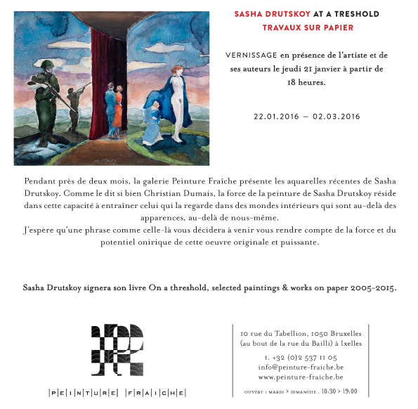 Pendant près de deux mois, la galerie Peinture Fraîche présente les aquarelle récentes de Sacha Drutskoy. Comme le dit si bien Christian Dumais, la force de la peinture de Sacha Drutskoy réside dans cette capacité à entraîner celui qui la regarde dans des mondes intérieurs qui sont au-delà des apparences, au-delà de nous-même. J'espère qu'une phrase comme celle-là vous décidera à venir vous rendre compte de la force et du potentiel de cette œuvre originale et puissante. Sacha Drutskoy signera son livre On a threshold, selected paintings & works on paper 2005-2015.