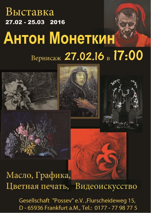 Антон Монеткин Антон Монеткин родился в 1974 году в Москве. В 1992-97 гг посещает Оперную студию и Школу современного искусства. До переезда в 1999 году в Германию как поздний переселенец, брал уроки вокала у солистки Московского театра им. Станиславского и Немировича-Данченко Натальи Горелик-Олениной. С 2001 года он занимает постоянное место в оперном хоре театра города Майнц и выставляет свои художественные произведения. C 2011 разрабатывает систему визуального сопровождения концертов и театральных постановок с помощью проекций видеоматериала в живом времени. На вернисаже художник расскажет о своих картинах, покажет некоторые видеоработы и несколько музыкальных номеров с видеосопровождением.