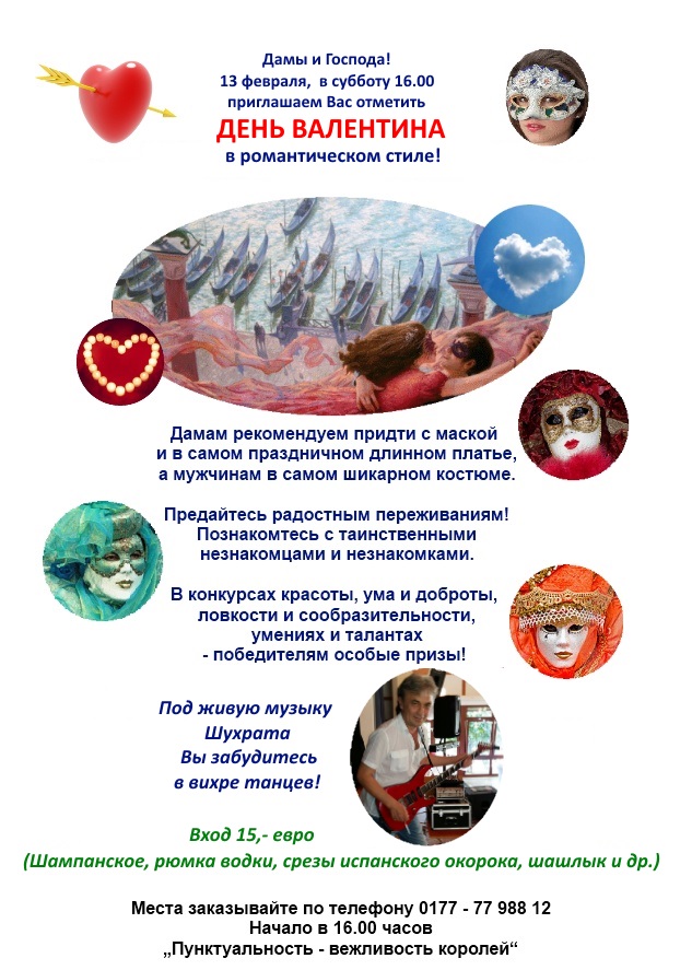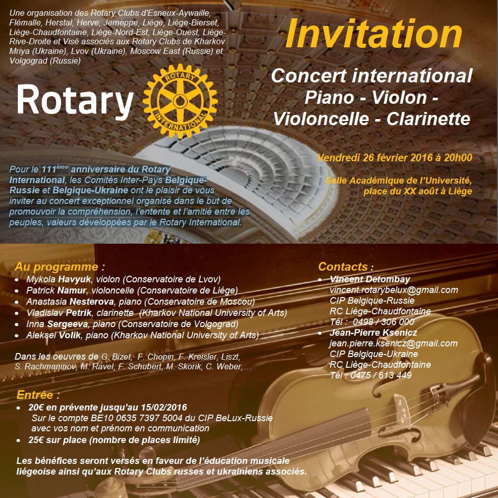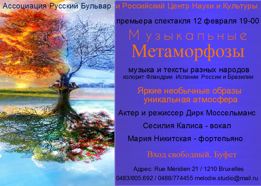 | 12/2 | Кастинг и открытый урок для кино-теле-медиа-академии | Francfort | | 12/2 | Музыкальные Метаморфозы. Métamorphoses musicales | Bruxelles | | 13,20,27/2 | Cours de prise de parole en public | Saint-Josse | | 13/2 | La poésie d'amour entre la Belgique, la Russie et la Chine | Liège | | 13/2 | День Валентина для взрослых | Francfort | | 16/2 | Вечер, посвящённый « Дню настоящих мужчин » | Francfort | | 18,19,20/2 | Boek voorstelling : « Gelukkig in de Sovjet-Unie » | Zwevegem/Kortrijk/Antwerpen | | 19/2 | 47ème bal russe Vitiaz. Russisch bal Vitiaz. Русский бал Витязей | Etterbeek | | 19/2 | Chants et danses de la mort de Moussorgski | Bruxelles | | 19/2 | Het russische Verre Oosten | Antwerpen | | 19/2 | Les soirées de l'Orchestre : L'Oiseau de feu | Liège | | 19-20/2 | Merveilles de la Voix et du Piano | Koekelberg | | 21/2 | L'étonnant voyage de Catherine II, la Grande | Liège | | 21/2 | Stage de danses des Balkans | Liège | | 21-23/2 | Stage de théâtre, traditions du théâtre russe | Saint-Josse | | 23/2 | Nieuwjaarsreceptie van de VLKVK | Antwerpen | | 27/2 | Petrouchka | Liège | | 28/2 | Les samedis en famille : Petrouchka | Liège |