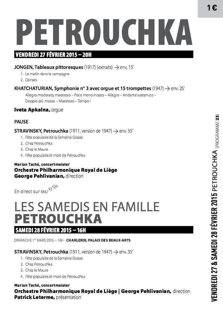 George Pehlivanian, direction Orchestre Philharmonique Royal de Liège Vous rêvez d’une fête foraine au cœur du Carnaval ? Découvrez le monde féérique de Petrouchka, la marionnette aux sentiments humains et partagez ses aventures avec ses comparses : la ballerine, le Maure, le montreur d’ours, les Bohémiennes... Créé en 1911, entre L’oiseau de feu et le Sacre du printemps, ce ballet de Stravinsky cite quelques chansons populaires dont la célèbre « Jambe de bois ». Un spectacle multimédia pour tous au cœur de la Russie légendaire.