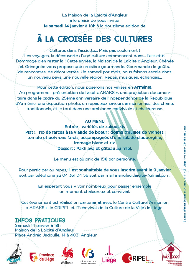 par l'asbl « ARAKS La Maison de la Laïcité d’Angleur a le plaisir de vous inviter à la douzième édition de À la croisée des cultures Cultures dans l’assiette... Mais pas seulement ! Les voyages, la découverte d’une culture commencent dans... l’assiette. Dommage d’en rester là ! Cette année, la Maison de la Laïcité d’Angleur, Chênée et Grivegnée vous propose une croisière gourmande. Gourmande de goûts, de rencontres, de découvertes. Un samedi par mois, nous faisons escale dans un nouveau pays, une nouvelle région. Repas, musiques, échanges... Pour cette édition, nous poserons nos valises en Arménie. Au programme : présentation de l’asbl « ARAKS », une projection documentaire dans le cadre du 25ème anniversaire de l’indépendance de la République d’Arménie, une exposition photo, un repas aux saveurs arméniennes, des chants traditionnels, et le tout dans une ambiance conviviale et chaleureuse. Au menu Entrée : variétés de zakouskis Plat : Trio de farces à la viande de boeuf : dolma (feuilles de vignes), tomate et poivrons farcis, accompagnés d’une salade d’aubergine, fromage blanc et riz. Dessert : Pakhlava et gâteau au miel. En espérant vous y voir nombreux pour passer ensemble un moment chaleureux et convivial.