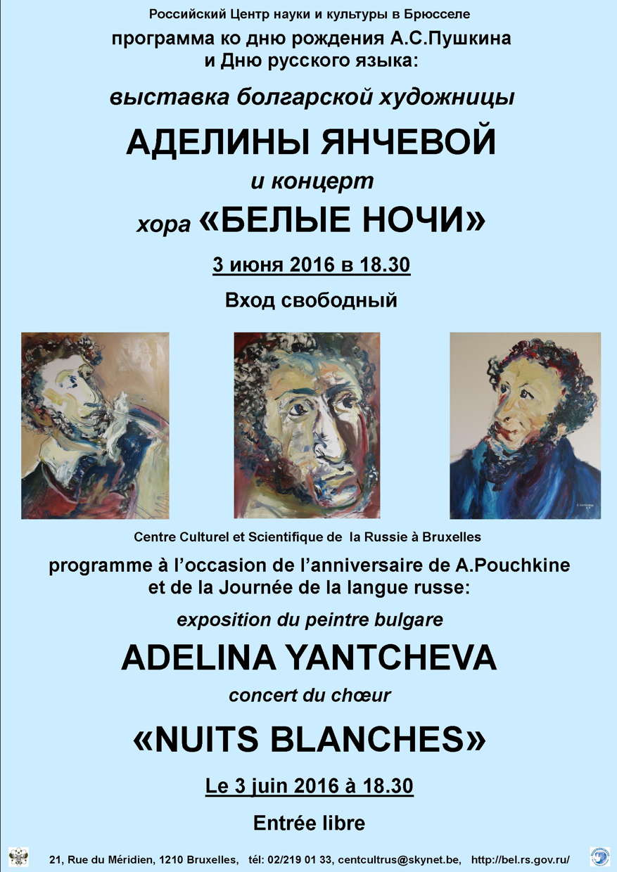 Programme à l'occasion de l'anniversaire de A. Pouchkine et de la Journée de la langue russe : Exposition du peintre bulgare Adelina Yantcheva et concert du cœur « Les Nuits Blanches ». Программа ко дню рождения А. С. Пушкина и Дню русского языка : выставка болгарской художницы Аделины Янчевой и концерт хора « Белце Ночи ».