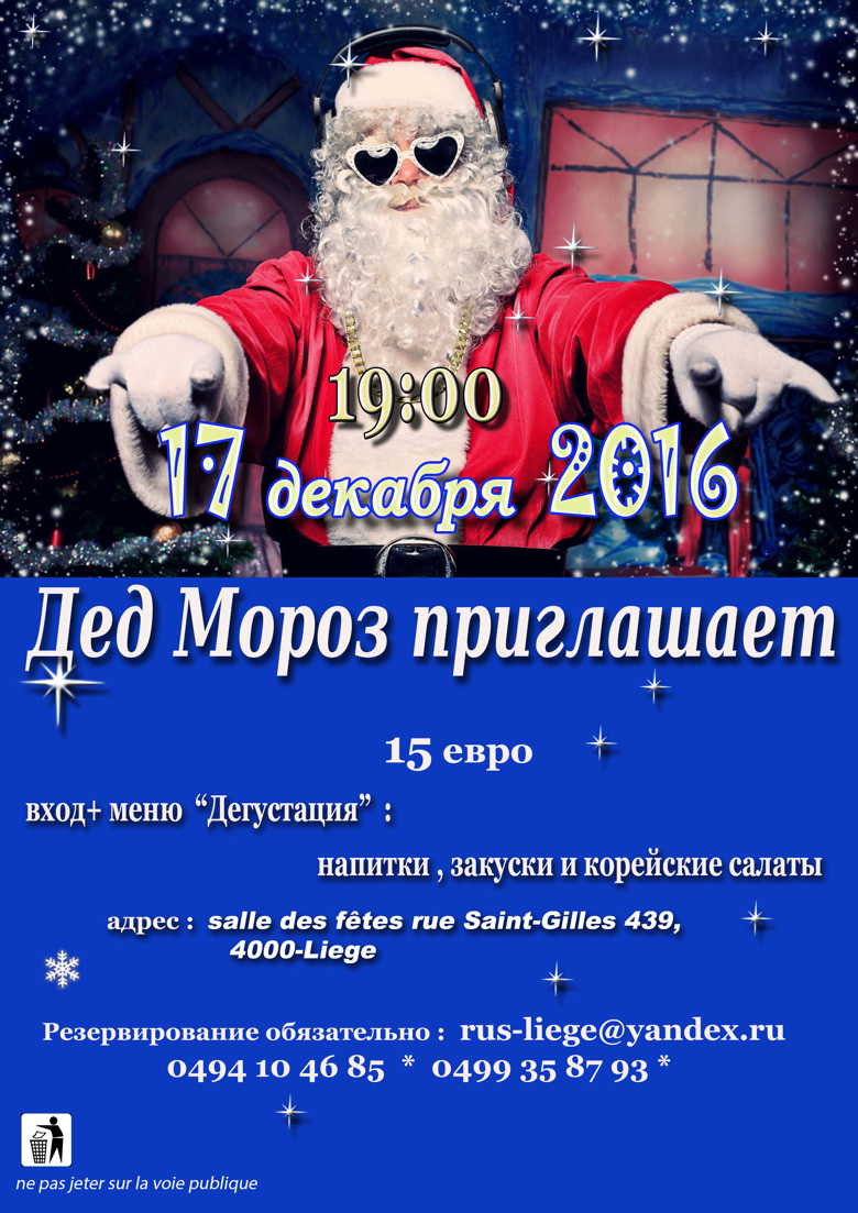 Art-Brusselski asbl - Ассоциация русскоязычных родителей « Брюссельки » Новогодняя сказка - это наше детство. Но чудеса бывают не только в сказке. Вчера 18 ноября был День рождения Деда Мороза! А ровно через месяц 18 декабря Дед Мороз приедет к нам на праздник, не пропустите это события! С 10 утра Вас ждёт ярмарка новогодних подарков, фотографии с новогодними персонажами, почта Деда Мороза, аква-грим, весёлые конкурсы и призы. Конечио же новогодняя сказка с Дедушкой Морозом и Снегурочкой и долгожданные подарки.