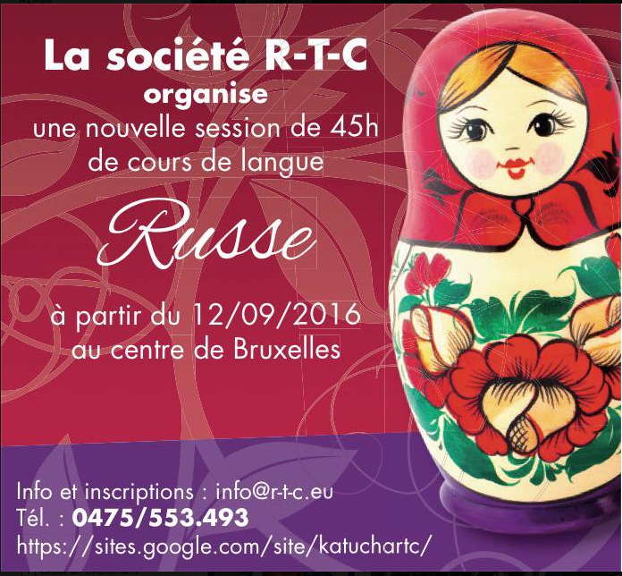 | Voici la liste succinte de toutes les d'activités culturelles qui nous ont été communiquées ou que nous avons relevées à ce jour à votre intention. Les liens vers toutes les annonces correspondantes - affiches, textes et illustrations - résident à cette adresse Internet : http://www.vava.be. N'hésitez pas à partager ces informations autour de vous. Dernières dates fin septembre :27 => Cinéma - Dans les forêts de Sibérie, Bouillon 28 => Conférence FPPR - Mémoire historique Emigration russe entre-2-guerres, Woluwé-Saint-Lambert par Mikhaïl Kovalev (Univ. Saratov) 29 => Concert - 110 anniversaire Chostakovitch, Saint-Josse-ten-Noode 30 => Vernissage - Halinka Jakubowska - Exposition sculptures, Herve 30 => Présentation roman - Les Exilés d'Isangi, Bruxelles Octobre 20161 => Sortie livre - Poutine, une vision du pouvoir, CH-1204 Genève 1 => Excursion - en autobus aux Pays-Bas 1 => Possev - Ouverture saison et jubilée. Вашему клубу 5 лет! D-65936 Sossenheim 2 => Cérémonie - Bois des Steppennes à Anthisnes 3&16 => Cinéma - Hamlet. Гамлет | Shakespeare à l'écran, Ixelles 6 => Ballet Live - The Bright Stream, Kinepolis 6 => Conférence - Ermitage, Saint-Petersbourg, musée le + complet du monde, Saint-Josse-ten-Noode 7 => Théâtre - Spectacle Скамейка (The Bench), Bruxelles 9 => Concert - Compositeurs polonais, Chenée 9 => Ska-Punk - Подумай, кто твои друзья. Think who is your friends, Bruxelles 10 => Football - match amical Russie – Belgique 10 => Lezing - Leven Russische elite door ogen van hun lijfeigene kunstenaars, Brussel 10 => Conférence - Russie et la Turquie : leçons d'histoire pour comprendre le présent, Ixelles 13 => Chants orthodoxes de Russie et d'Ukraine, Wavre 14 => Vernissage - Art d'ici et d'ailleurs. Expo artistes pays de l'Est, Huy 14 => Concert - Piano-Violin charity concert, Bruxelles 15 => Welcome party - Открытие сезона 2017 Trix, Schaerbeek 18 => Récital - Моя Россия (Ma Russie) : Tchaikowski & Rachmaninov, Bruxelles 19-23 => Masterclasse de chant Triomphe de l’Art, Jette 20 => Concert - Violons de la paix, Bruxelles 20 => Yuri Bashmet solistes et orchestre de chambre de Moscou, Antwerpen 22 => Chants russes et tsiganes par l'Ensemble Karandash, Lesve 24 => Lezing - Sociaal portret Russische maatschappij, wanneer schilders het gewone volk ontmoeten, Brussel Cours de russe : Cette année, la professeur Vera Pavlovskaya continue à prodiguer ses cours de langue russe niveau avancé et débutant au Centre culturel russe rue Lesbroussart 7, 1050 Ixelles. Les cours se donnent les samedis dès 9h30' pour totaliser 100 heures pour cette année académique qui commence en octobre. Le groupe des débutants peut encore accueillir 3-4 personnes. Les candidats commençant de 0 sont les bienvenus pour compléter le groupe. Courriel de contact : vera.pavlovskaya at gmail dot com |