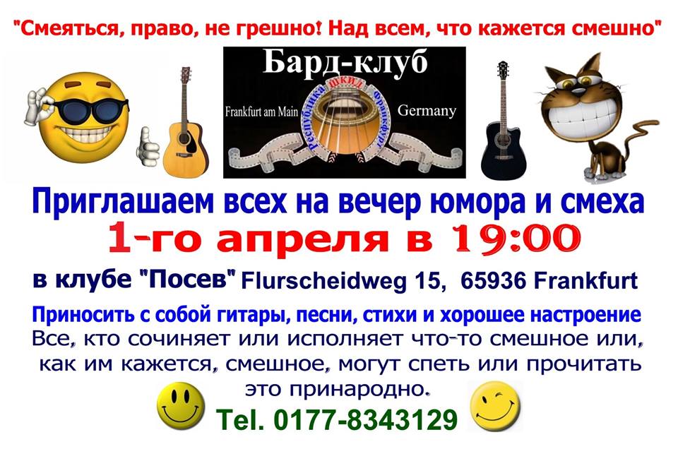 Приглашаем всех на вечер юмора и смеха. « Смеяться, право, не грешно! Над всем, что кажется смешно ». Приносить с собой гитары, песни, стихи и хорошее настроение. Все, кто сочиняет или исполняет что-то смешное или, как им кажется, смешное, могут спеть или прочитать это принародно.