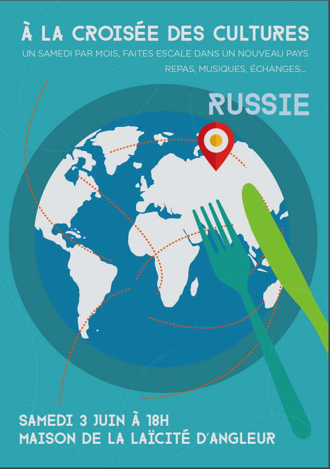 UN SAMEDI PAR MOIS, FAITES ESCALE DANS UN NOUVEAU PAYS REPAS, MUSIQUES, ÉCHANGES... Présentation, musique, danses et repas russe • 15€ par personne Inscription avant le 31 mai : 04 361 04 56 ou angleur.laicite at gmail.com. Au menu Entrée : Salade traditionnelle « Lucien Olivier », façon moderne Plat : Rôti du compte Orloff, pomme de terre grenaille aux baies de Sibérie. Dessert : Pomme déglacée de l’amitié belgo-russe, accompagnée de la dame blanche de l’ancienne Russie. Le menu est au prix de 15€ par personne.