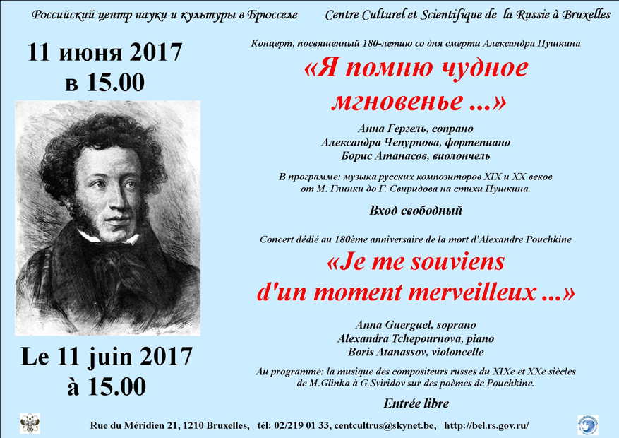 Organisé par International A.S. Pushkin Foundation en collaboration avec le Willemsfonds Laken Международный Фонд А.С.Пушкина в Королевстве Бельгия и Фонд Виллемса в Лакене приглашают к памятнику Александра Сергеевича Пушкина в Брюсселе, в коммуне Лакен, на торжества, посвященные Дню рождения поэта. Тема этого года - « А.С.Пушкин и друзья ». Программа мероприятия - Приветственное слово Эльс Амп, Президента Фонда Виллемса Лакен - Приветственное слово Марии Мадлен Пушкиной-Дурново, Президента Международного фонда А.С.Пушкина - Приветственное слово Дмитрия Бородина, Советника - посланника Посольства РФ в Бельгии - Вводный спектакль в постановке Камилля Де Гинса и Александра Пушкина - Декламация стихотворения "Мой портрет" в исполнении Камиля Де Гинса и Хермана Де Менекенса на французском и нидерландском языках. - Выступление детей студии « Danza Znaika » - Музыкальное интермеццио скрипача Денеса Дозтана. (фрагмент оперы « Евгений Онегин » П.И.Чайковского) - Кто был Эварист Де Парни и каковы были его взаимоотношения с А.С.Пушикным - Декламация стихов А.С.Пушкина - Камилль Де Гинс и Оксана Бого - Кто был Проспер Мериме и каковы были его взаимоотношения с А.С.Пушкиным - Музыкальное интермеццио Денеса Дозтана - Кто был Николай Гоголь. Чтение отрывка из произведения « Нос » - Закрытие торжеств - Александр Пушкин и Камилль Де Гинс - Возложение цветов к памятнику А.С.Пушкина - Прием в Nekkersdal Note : Дорогие друзья, мы рады сообщить вам о том, что определена дата Благотворительного Гала вечера. 17 ноября 2017 г. в Шато дю Лак - Женваль состоится шестой Гала вечер и Церемония награждения Международной благотворительной премией « Русское Наследие »>. Премия учреждена Международным Фондом А.С. Пушкина во главе с его президентом Марией Мадлен Дурново Пушкиной и вице президентом Александром Александровичем Пушкиными, прямыми потомками поэта, проживающими в Брюсселе.