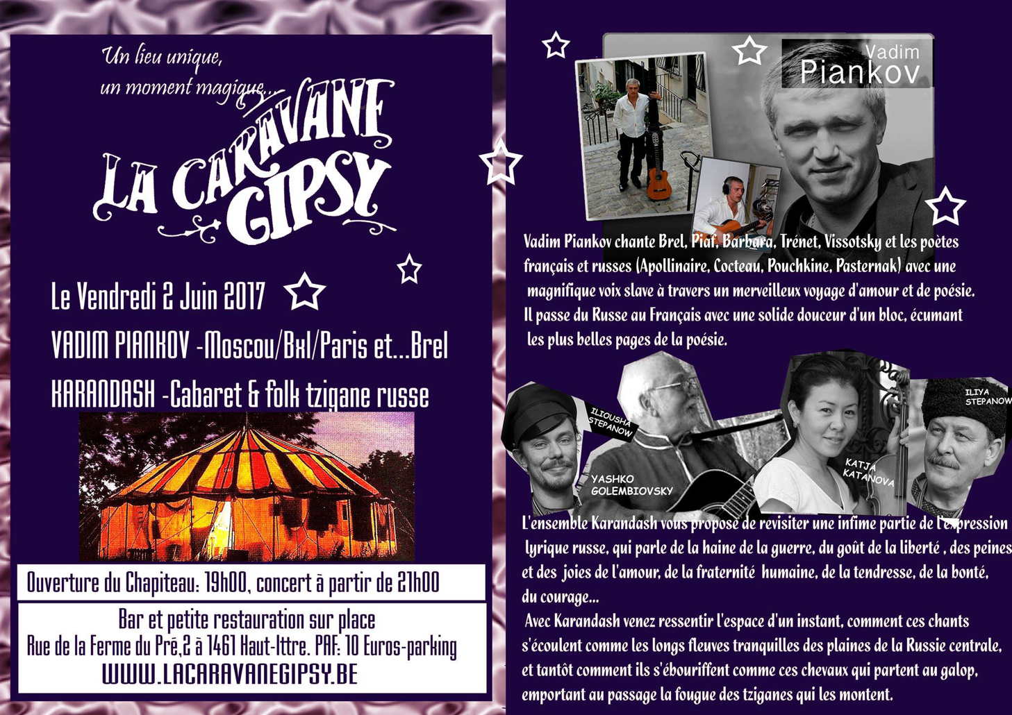 Vadim Piankov - Moscou/Bruxelles/Paris et... Brel Iliousha Stepanow, Yashko Golembiowsky, Katja Katanova, Iliya Stepanow - Karandash - Cabaret et folk tsigane russe Vadim Piankov chante Brel, Piaf, Barbara, Trénet, Vissotsky et les poètes français et russes (Apollinaire, Cocteau, Pouchkine, Pasternak) avec une magnifique voix slave à travers un merveilleux voyage d'amour et de poésie. Il passe du Russe au Français avec une solide douceur d'un bloc, écumant les plus belles pages de la poésie. L'ensembe Karandash vous propose de revisiter une infime partie de l'expression lyrique russe, qui parle de la haine de la guerre, du goût de la liberté, des peine et des joies de l'amour, de la fraternité humaine, de la tendresse, de la bonté, du courage... Avec Karandash venez ressentir l'espace d'un instant, comment ces chants s'écoulent comme les longs fleuves tranquilles des plaines de la Russie centrale, et tantôt comment ils s'ébouriffent comme ces chevaux qui partent au galop, emportant au passage la fougue des tziganes qui les montent.