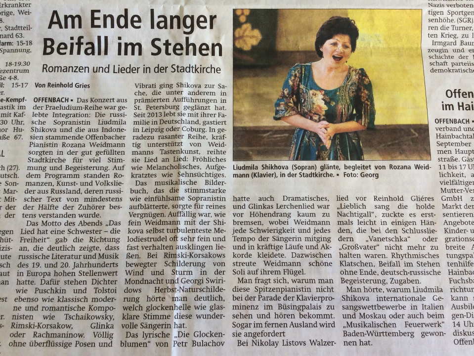 Концерт оперной певицы Людмилы Шиховой и пианистки Екатерины Нежновой. | Offenbach. Konzert. Am Ende langer Beifall im Stehen von Reinhold Gries. Romanzen und Liederin der Stadtkirche. |