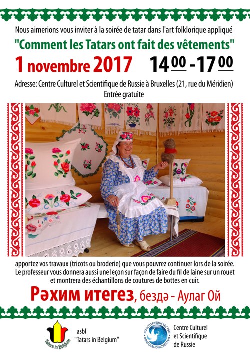 Asbl Tatars in Belgium. Nous aimerions vous inviter à la soirée des Tatars dans l'art folklorique appliqué. Apportez vos travaux (tricots ou broderie) que vous pouvez continuer lors de la soirée. Le professeur vous donnera aussi une leçon sur la façon de faire du fil de laine sur un rouet et montrera des échantillons de coutures de bottes de cuir.