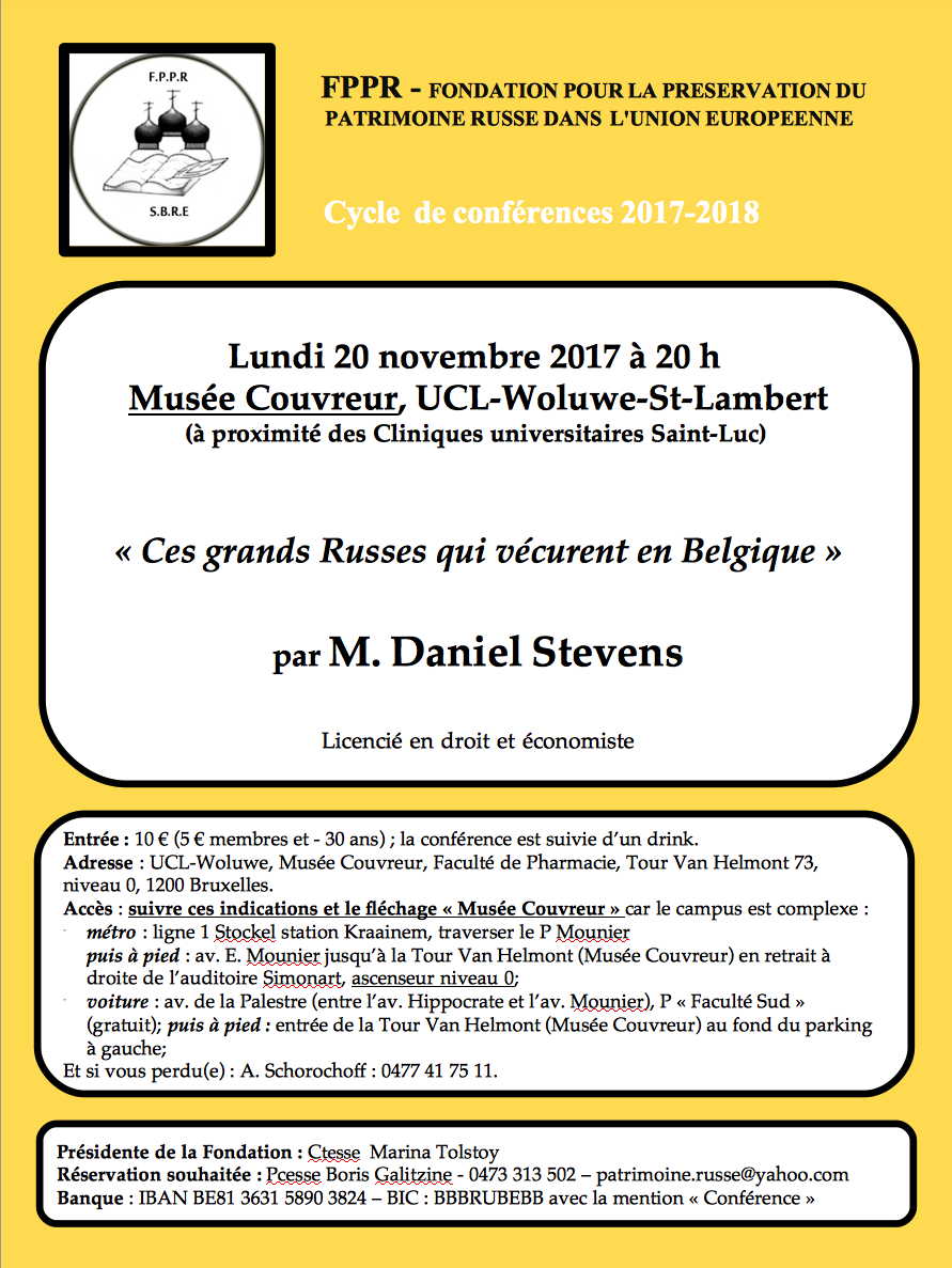 Carton-réponse « Gala du Patrimoine Pouchkine 2017 » Ayez l'amabilité de nous renvoyer par courriel à alexandre at pouchkine.org les informations relatives à votre participation : - identités (noms, prénoms) et courriels/téléphones des personnes présentes ; - votre versement de 125 € par personne avant le 1er novembre et 150 € passé cette date ; - votre réservation éventuelle d'une chambre (à préciser single/twin/double). Prix : 119 € chambre, petit déjeuner buffet inclus et de verser le total de votre réservation sur le compte bancaire BE44 3630 2325 1445 BIC : BRUBEBB de la Fondation Internationale Pouchkine, avenue de Fré 106/1 à 1180 Bruxelle