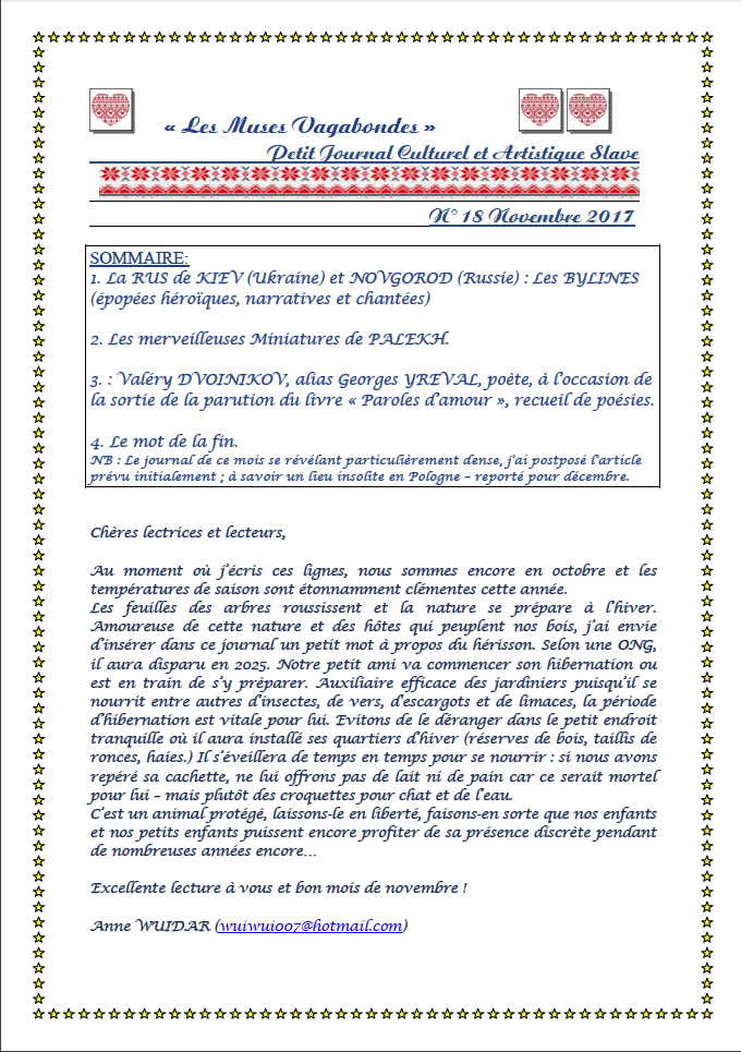 Sommaire : 1. La RUS de KIEV (Ukraine) et Novgorod (Russie) : Les Bylines (épopées héroïques, narratives et chantées) 2. Les merveilleuses Miniatures de Palekh 3. : Valéry Dvoinikov, alias Georges Yréval, poète, à l’occasion de la sortie de la parution du livre « Paroles d’amour », recueil de poésies. 4. Le mot de la fin. NB : Le journal de ce mois se révélant particulièrement dense, j’ai postposé l’article prévu initialement ; à savoir un lieu insolite en Pologne – reporté pour décembre.