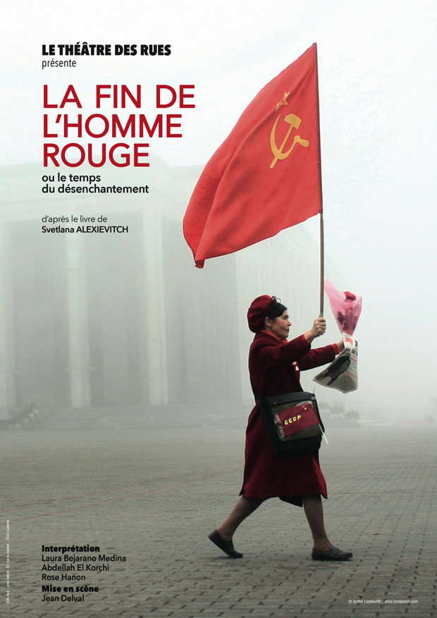 d'après le livre de Svetlana Alexievitch Nouvelle création du Théâtre des Rues (Mons) Interprétation : Laura Bejarano Medina, Abdellah El Korchi et Rose Hanon Mise en scène : Jean Delval 1917 – 2017 Le centenaire de la révolution soviétique qui a conditionné l’histoire mondiale du 20ème siècle. L’URSS a cessé d’exister dans les années 1990. Avec quels impacts sur sa population ? Avec quels effets sur l’évolution du monde? Qu’en est-il de la mentalité du peuple russe d’aujourd’hui? Comment a-t-il vécu (ou survécu) cette transformation abrupte d’une société socialiste fermée et oppressante en une société capitaliste féroce et impitoyable? Quel est son ressentiment face à l’attitude triomphale et arrogante de l’Occident aujourd’hui champion du néolibéralisme? A quelles évolutions politiques aspire-t-il : fuite en avant nationaliste? retour au socialisme? désespoir slave? réminiscence de la mystérieuse âme russe? grandeur tsariste et impérialiste?… Autant de questions – et bien d’autres – (au-delà des formules simplistes et des propagandes de tous poils) qui se dégagent des témoignages recueillis par Svetlana Alexievitch, prix Nobel de littérature 2015, dans son ouvrage intitulé : «La Fin de l’Homme rouge ou Le temps du désenchantement» (Éditions Actes-Sud et Babel). Dans «La fin de l’Homme rouge», nous entendons des vivants, perdus, désorientés, rageurs, tous porteurs de questions existentielles et qui nous disent : «Qui êtes-vous pour nous juger? Qu’auriez-vous fait de mieux à notre place?» Margarita Pogrebitskaïa, médecin, 57 ans « Je suis sur les épaules de mon père, et j’ai un ballon rouge attaché au poignet. Dans le ciel, au-dessus des colonnes qui défilent, d’immenses portraits de Lénine et de Staline… de Marx… Des guirlandes et des grappes de ballons rouges, bleus, jaunes… Le rouge, c’est ma couleur préférée. La couleur de la révolution, la couleur du sang versé en son nom… La grande révolution d’Octobre! Maintenant, on dit «le coup d’État», le «complot bolchevique»… «le désastre russe»… Lénine était un agent de l’Allemagne, et la révolution a été faite par des déserteurs et des marins ivres… Je me bouche les oreilles, je ne veux pas entendre ça! C’est au-dessus de mes forces… Toute ma vie, j’ai vécu avec ma foi : nous étions les plus heureux, nous étions nés dans un pays magnifique, comme il n’en avait jamais existé. Il n’y avait aucun autre pays comme ça! Nous avions la place Rouge, et sur la tour du Sauveur sonnait un carillon qui donnait l’heure exacte au monde entier ».