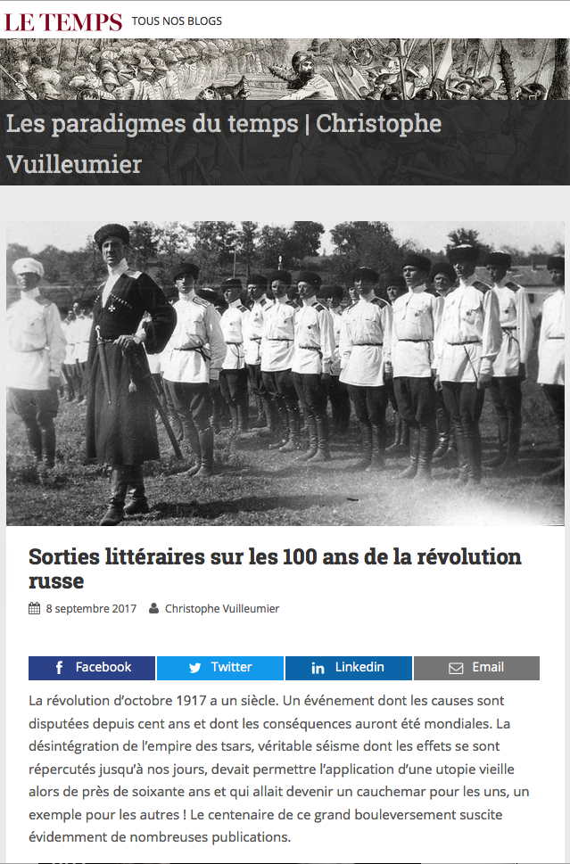 https://blogs.letemps.ch/christophe-vuilleumier/2017/09/08/sorties-litteraires-sur-les-100-ans-de-la-revolution-russe/ https://www.autrement.com/ouvrage/que-faire-de-1917-olivier-besancenot Olivier Besancenot : « Le vrai héros de la Révolution russe, c'est le peuple » => https://www.youtube.com/watch?v=k92u2mjqOe8