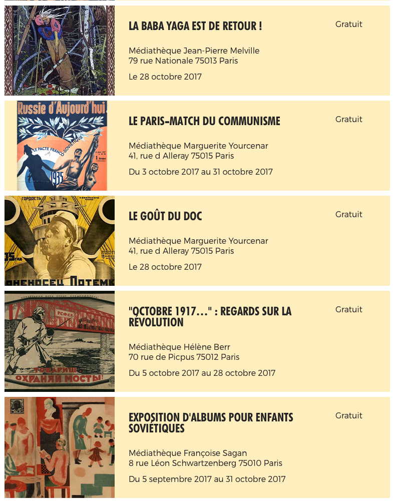 NEXT   ANNONCES Événements du mois d'octobre de l'année 2017 [119] : - sans session : - afficher la première notice du mois en Layout Page la notice dont l'IDEvent - le mois est déterminé par le champ firstMonth de la notice - erreur si notice non trouvée dans le vecteur du mois passé par l'URL