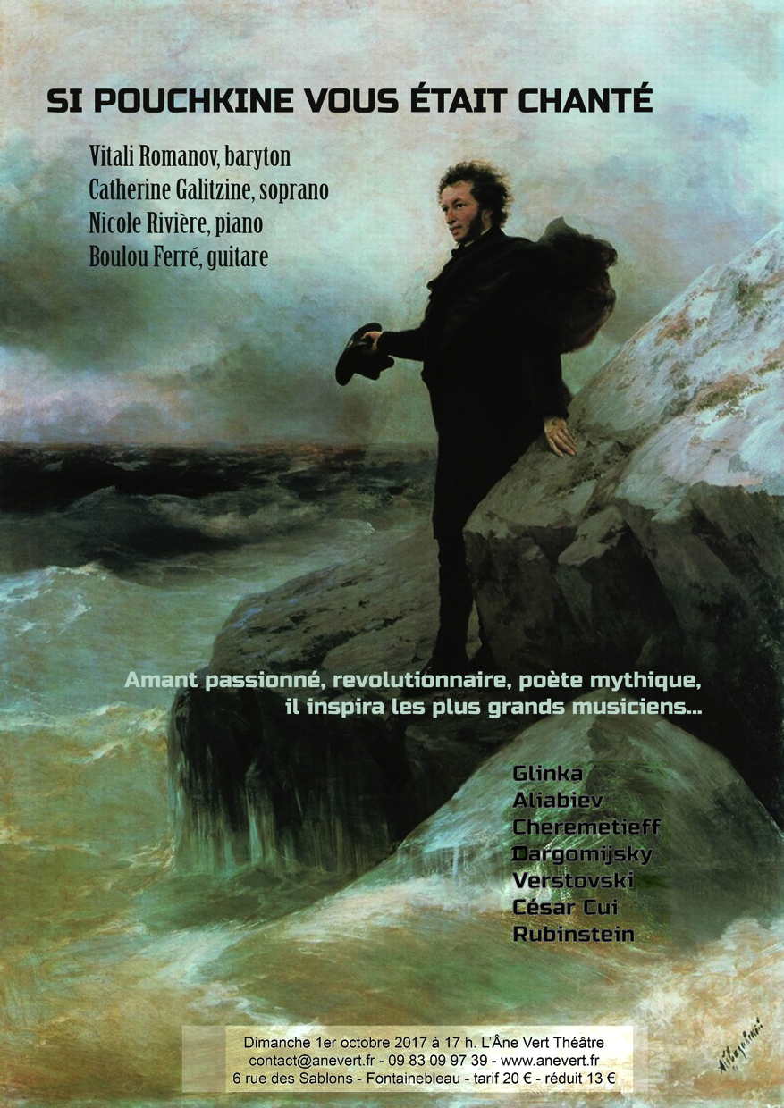 Vitali Romanov, baryton; Catherine Galitzine, soprano; Nicole Rivière, piano et Boulou Ferré, guitare. Amant passionné, révolutionnaire, poète mythique, il inspira les plus grands musiciens : Glinka, Alibiev, Cheremetieff, Dargomijsky, Verstovski, César Cui, Rubinstein. Chers amis, Un petit rappel pour ceux à qui la nouvelle aurait échappé... Dimanche prochain, 1er oct. à 17h00, au théâtre de l'Ane Vert, 6 rue des Sablons, à Fontainebleau; Vitali Romanov (ex-soliste de l'opéra de Saint-Petersbourg) et moi même vous raconteront en vers et en musique la vie du grand écrivain-poète Alexandre Pouchkine . Pas de panique! Les textes et dialogues sont en français, les mélodies en russe. Nous serons accompagnés au piano par Natacha Medvedeva qui vient de remporter le premier Prix au Festival International de musique juive à Amsterdam. Le théâtre de l'Ane Vert est un charmant petit théâtre dissimulé dans une ravissante cours tapissée de verdure et qui ne compte que 72 places. . Bien chaleureusement, Catherine.