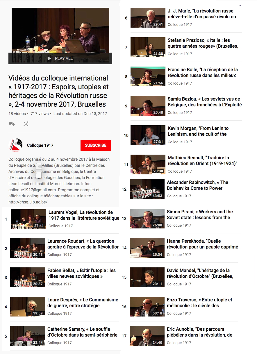 1 Laurent Vogel, « La révolution de 1917 dans la littérature soviétique » (Bruxelles, 2017) 2 Laurence Roudart, « La question agraire à l’épreuve de la Révolution russe » (Bruxelles, 2017) 3 Fabien Bellat, « Bâtir l’utopie : les villes neuves soviétiques » (Bruxelles, 2017) 4 Laure Després, « Le Communisme de guerre, entre stratégie désespérée et utopie anti-chrématistique » (Bruxelles, 2017) 5 Catherine Samary, « Le souffle d’Octobre dans la semi-périphérie yougoslave » (Bruxelles, 2017) 6. Jean-Jacques Marie « La révolution russe relève-t-elle d’un passé révolu ou appartient-elle toujours au présent ? » (Bruxelles, 2017) 7. Stefanie Prezioso, « Italie : les quatre années rouges » (Bruxelles, 2017) 8. Francine Bolle, « La réception de la révolution russe dans les milieux syndicaux en Belgique » (Bruxelles, 2017) 9. Samia Beziou, « Les soviets vus de Belgique, des tranchées à L’Exploité » (Bruxelles, 2017) 10. Kevin Morgan, « From Lenin to Leninism, and the cult of the individual » (Bruxelles, 2017) 11. Matthieu Renault, « Traduire la révolution en Orient (1919-1924)"» (Bruxelles, 2017) 12. Alexander Rabinowitch, « The Bolsheviks Come to Power Revisited : Centennial Reflections » (Bruxelles, 2017) 13. Simon Pirani, « Workers and the Soviet state : lessons from the 1920 » (Bruxelles, 2017) 14. Hanna Perekhoda, "Quelle révolution pour un peuple opprimé ? Ukraine 1917-1922 » (Bruxelles, 2017) 15. David Mandel, "« L'héritage de la révolution d'Octobre » (Bruxelles, 2017) 16. Enzo Traverso, « Entre utopie et mélancolie : le siècle des révolutions » (Bruxelles, 2017) 17. Eric Aunoble, « Des parcours plébéiens dans la révolution, de l'utopie à la bureaucratie » (Bruxelles, 2017)
