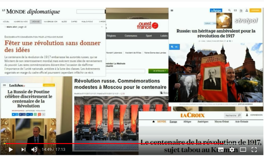 par J.-J. Marie Jean-Jacques Marie (CERMTRI) : « La révolution russe relève-t-elle d’un passé révolu ou appartient-elle toujours au présent ? », , intervention au colloque international "1917-2017 : Espoirs, utopies et héritages de la Révolution russe", du 2 au 4 novembre 2017, Maison du Peuple de Saint-Gilles, Bruxelles. Panel 3 – Actualité de la révolution russe – présidence de séance : Jean-Michel De Waele (ULB). Organisé par le Centre des Archives du Communisme en Belgique (CArCoB), le Centre d’Histoire et de Sociologie des Gauches (ULB), la Formation Léon Lesoil et l’Institut Marcel Liebman. Avec le soutien de : la Faculté de Philosophie et Sciences Sociales de l’Université libre de Bruxelles, la FGTB fédérale, le Fonds national de la Recherche scientifique (FNRS), l'Association des amis de Jost Steiger (Lausanne), l'Université populaire de Bruxelles et Fédération Wallonie-Bruxelles.