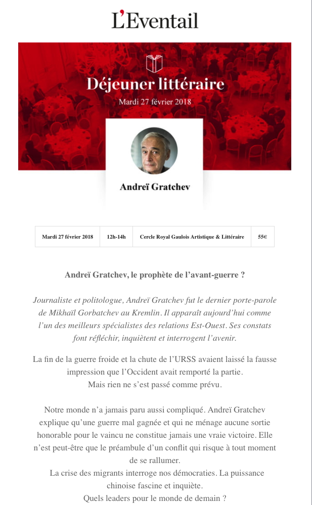 Cet entretien sera animé par Patrick Weber Journaliste et politologue, Andreï Gratchev fut le dernier porte-parole de Mikhaïl Gorbatchev au Kremlin. Il apparaît aujourd’hui comme l’un des meilleurs spécialistes des relations Est-Ouest. Ses constats font réfléchir, inquiètent et interrogent l’avenir. La fin de la guerre froide et la chute de l’URSS avaient laissé la fausse impression que l’Occident avait remporté la partie. Mais rien ne s’est passé comme prévu. Notre monde n’a jamais paru aussi compliqué. Andreï Gratchev explique qu’une guerre mal gagnée et qui ne ménage aucune sortie honorable pour le vaincu ne constitue jamais une vraie victoire. Elle n’est peut-être que le préambule d’un conflit qui risque à tout moment de se rallumer. La crise des migrants interroge nos démocraties. La puissance chinoise fascine et inquiète. Quels leaders pour le monde de demain ? Andreï Gratchev possède un art rare de la synthèse. Il revient sur le règne des idéologies et s’interroge sur le phénomène du national-populisme qui se réveille autant en Europe, qu’en Asie ou aux Etats-Unis et pointe les fautes de l’Occident.