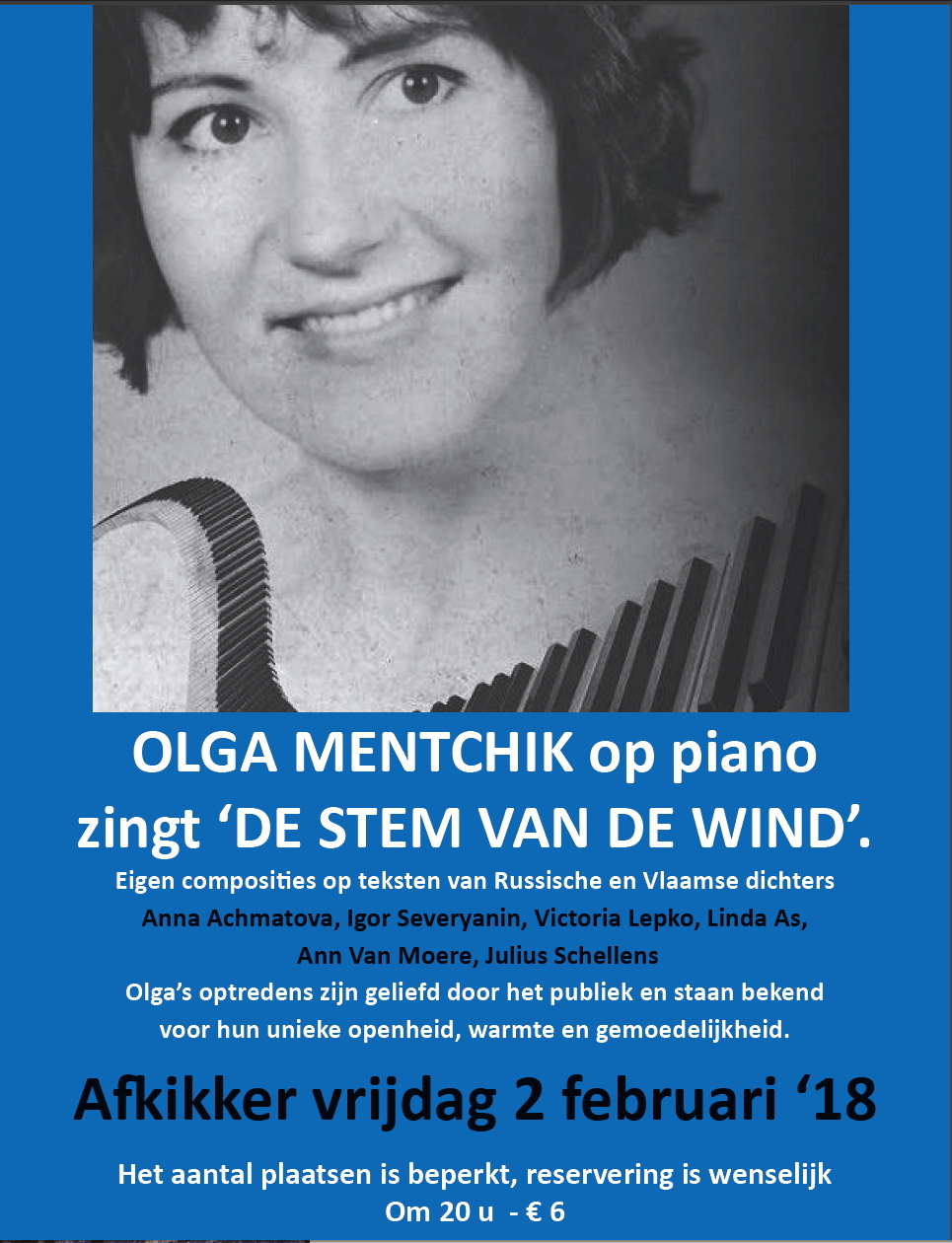 Дорогие друзья! Приглашаем вас в Гент 2 февраля на новую программу композитора Ольги Менчик « Голос Ветра », название которой было заимствовано из стихотворения А. Ахматовой « Ива ». Голос Ветра - для Ольги символ связи лучшей поэзии прошлого столетия с современным творчеством. Своей музыкой она доказывает, что вибрации Ахматовой не умерли, а продолжают жить и вдохновлять наших современников. Всю информацию о концерте вы найдете в афише. До скорой встречи! С уважением, Русский Бульвар, г. Гент.