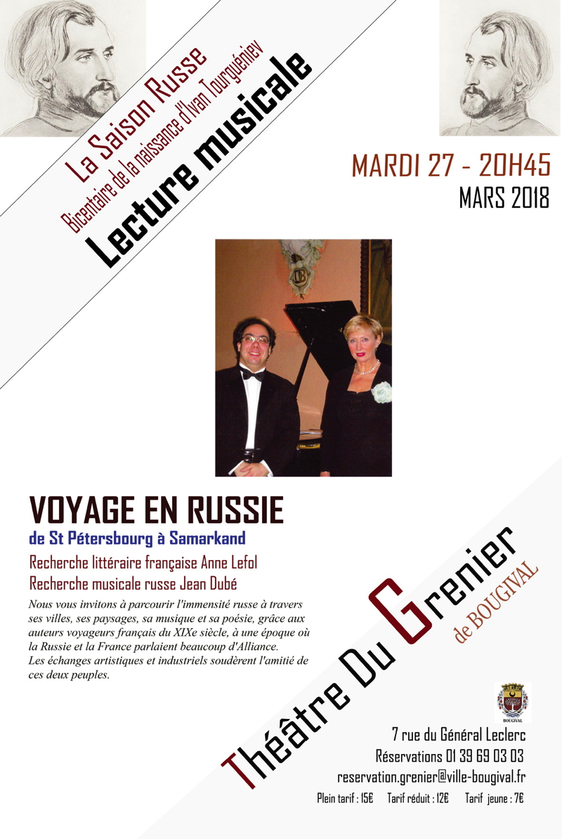 Lecture musicale, Recherche littéraire française, Anne Lefol, Recherche musicale russe, Jean Dubé Saison russe : Bicentenaire de la naissance d'Ivan Tourguéniev. Nous vous invitons â parcourir l'immensité russe à travers ses villes, ses paysages, sa musique et sa poésie, grâce aux Auteurs Voyageurs Français du XIX° siècle, à une époque où la Russie et la France parlaient beaucoup d'Alliance. Les échanges artistiques et industriels soudèrent l'amitié de ces deux peuples. Hier, comme aujourd'hui, c'est une belle histoire d'Amour.