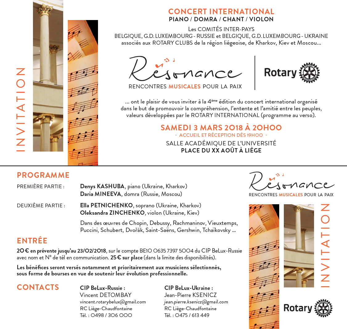 ENTRÉE 20 € en prévente jusqu’au 23/02/2018, sur le compte BE10 0635 7397 5004 du CIP BeLux-Russie avec nom et N° de tél en communication. 25 € sur place (dans la limite des disponibilités). Les bénéfices seront versés notamment et prioritairement aux musiciens sélectionnés, sous forme de bourses en vue de soutenir leur évolution professionnelle. Contacts : CIP BeLux-Russie : Vincent DETOMBAY / vincent.rotarybelux at gmail.com / RC Liège-Chaudfontaine / Tél. : 0498 30 60 00 CIP BeLux-Ukraine : Jean-Pierre KSENICZ / jean.pierre.ksenicz at gmail.com / RC Liège-Chaudfontaine / Tél. : 0475 61 34 49