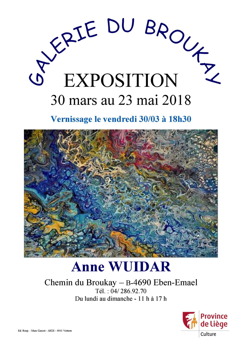 Je serais très heureuse de vous revoir au vernissage de mon exposition à la Galerie du Moulin du BROUKAY à EBEN-EMAEL, le vendredi 30 mars à 18h30 ; un moment de ressourcement, de partage de bonne humeur et d'impressions. L'affiche fait office d'invitation et espère que vous m'adresserez un mail pour me dire si vous participerez à cet événement. Je vous informerai au fur et à mesure, via ma page Facebook des moments durant lesquels je serai présente sur les lieux de l’exposition où j’espère vous rencontrer et savourer votre présence. Vernissage le vendredi 30 mars à 18 heures 30' Cordialement, Anne Wuidar.