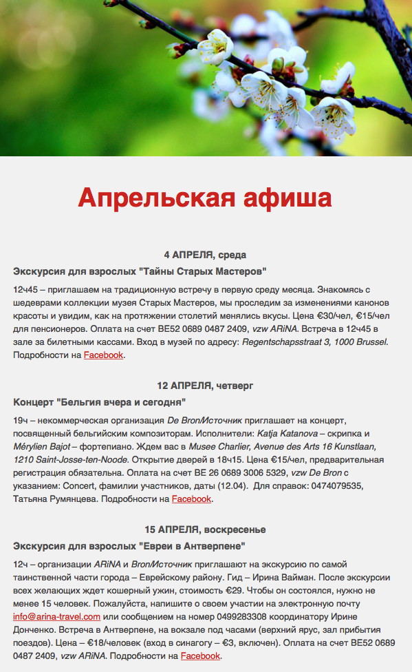 Цена €30/чел, €15/чел для пенсионеров. Оплата на счёт BE52 0689 0487 2409, vzw ARiNA. Встреча в 12ч45 в зале за билетными кассами.