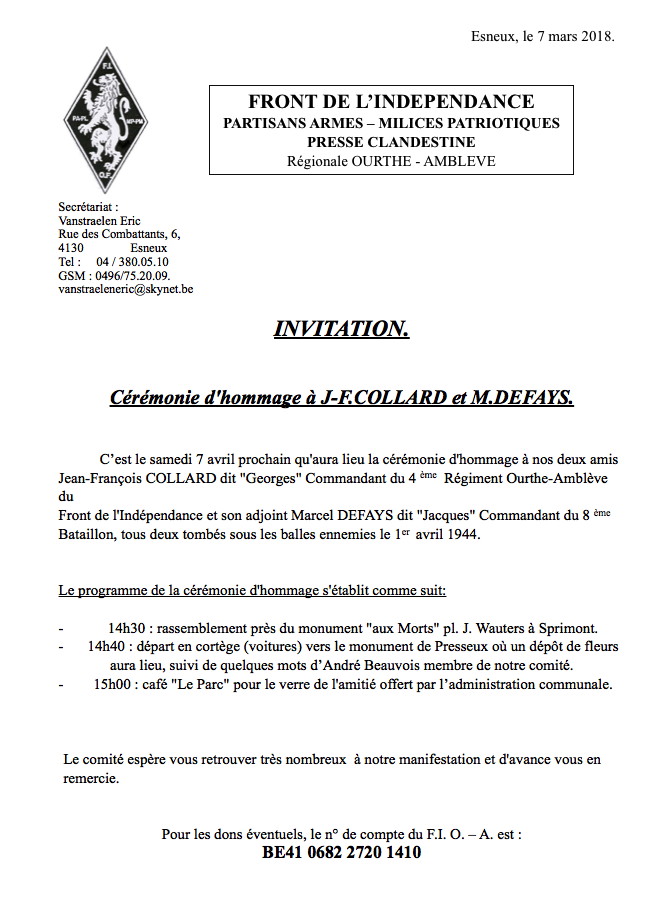 Front de l'Indépendance. Partisans armés - Milices patriotiques - Presse clandestine. Régionale Ourthe-Amblève C’est le samedi 7 avril prochain qu'aura lieu la cérémonie d'hommage à nos deux amis Jean-François COLLARD dit "Georges" Commandant du 4 ème Régiment Ourthe-Amblève du Front de l'Indépendance et son adjoint Marcel DEFAYS dit "Jacques" Commandant du 8 ème Bataillon, tous deux tombés sous les balles ennemies le 1er avril 1944. Le programme de la cérémonie d'hommage s'établit comme suit : - 14h30 : rassemblement près du monument "aux Morts" pl. J. Wauters à Sprimont. - 14h40 : départ en cortège (voitures) vers le monument de Presseux où un dépôt de fleursaura lieu, suivi de quelques mots d’André Beauvois membre de notre comité. - 15h00 : café "Le Parc" pour le verre de l'amitié offert par l’administration communale. Le comité espère vous retrouver très nombreux à notre manifestation et d'avance vous en remercie.