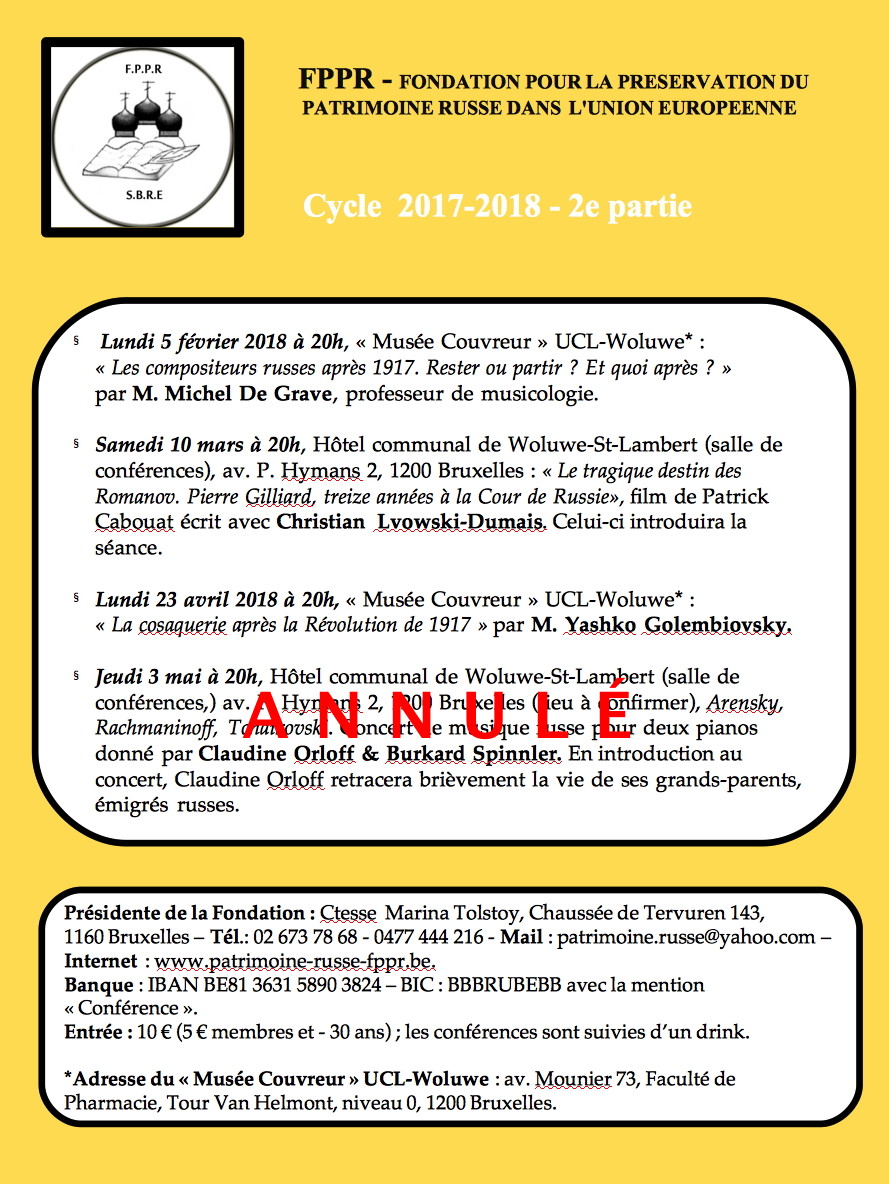 par Claudine Orloff & Burkard Spinnler. FPPR - Fondation pour la Préservation du Patrimoine Russe dans l'Union Européenne, asbl SBRE – Stichting voor de Bewaring van het Russische Erfgoed in de Europese Unie, vzw Cycle de conférences FPPR 2017-2018 Concert de musique russe pour deux pianos donné par Claudine Orloff & Burkard Spinnler. En introduction au concert, Claudine Orloff retracera brièvement la vie de ses grands-parents émigrés russes.