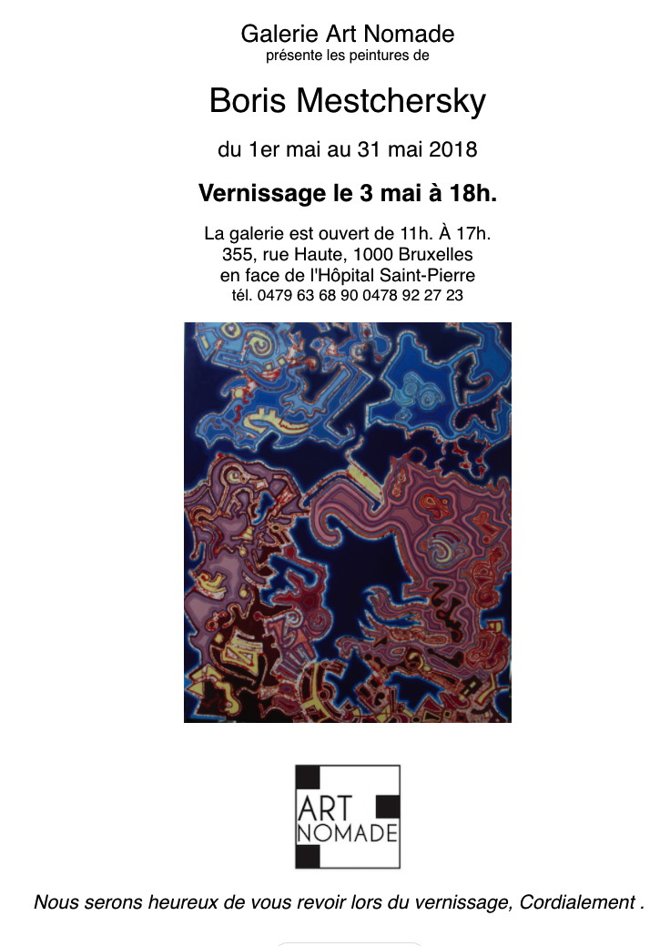La Galerie Art Nomade présente les peintures de Boris Mestchersky du 1er mai au 31 mai 2018 Vernissage le 3 mai 2018 à 18 heures Nous serons heureux de vous revoir lors du vernissage, Cordialement.