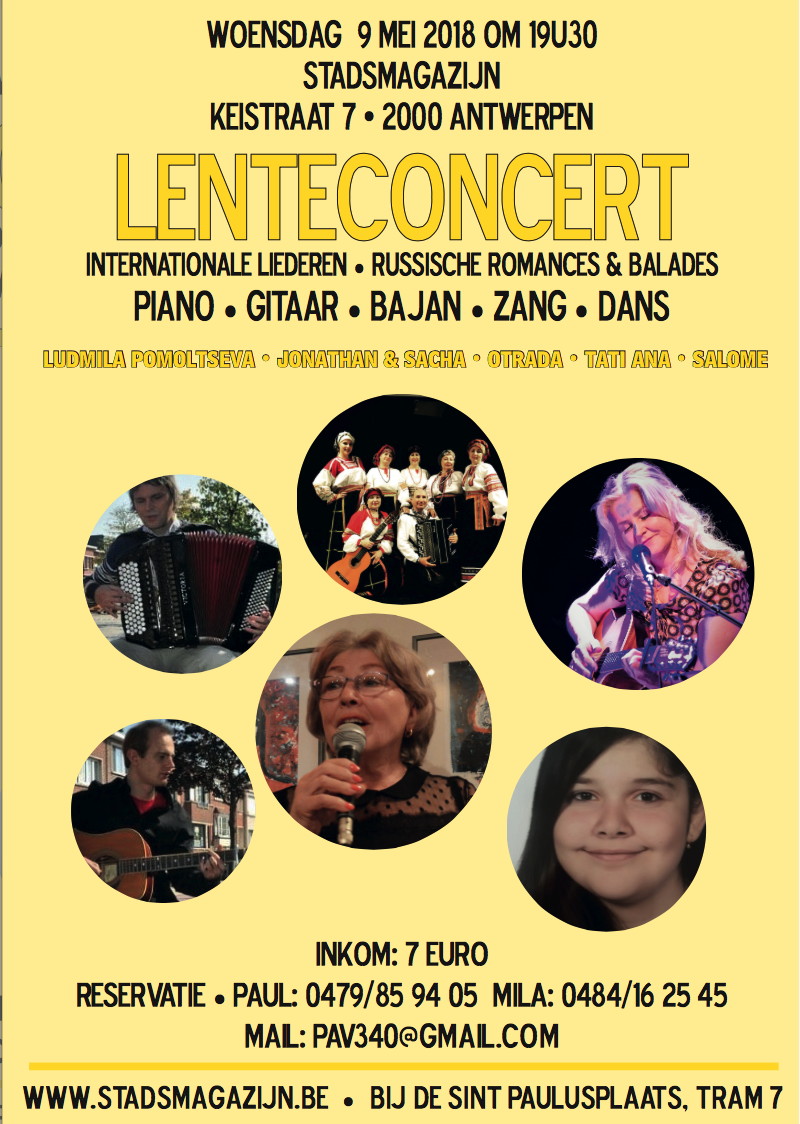 1 => Poësie op muziek als bloesems midden de terreur (Gent) 2-3 => Concert chorale et orchestre - Saison russe (Bougival) 2 => Wandelgangen van het Geheugen (Gent) 2 => SJOOT (Auderghem) 2 => Anton Tchekhov (Bougival) 2 => Vente Art russe (Paris) 2-3 => Экскурсия Прекрасный Париж (Paris) 2 => Вечер/лекция Татьяны Толстой (Bruxelles) 2 => « Спаси и сохрани » (Sossenheim) 3,9-10,17,23 => Table/Atelier langue russe (Nivelles) 3 => Musée « Игрушечная история » (Bruxelles) 4/6 => Barbusse, Merejkovski, Robakidze (Paris) 5 => France, Manifeste écologique et social (Bruxelles) 6 => Movie Sobibor. Собибор (Bruxelles) 6 => Экскурсия Pieter Brueghel (Bruxelles) 7 => Au cœur du Kremlin (Bruxelles) 7 => FPPR - Assemblée générale statutaire (Bruxelles) 7 => Boris Godounov (Hechtel-Eksel) 9 => Бизнес в Бельгии (Ixelles) 9 => Один мужчина и одна женщина (Antwerpen) 10 => Ballet Live 2018 : Coppélia (Kinepolis) 10 => Экскурсия с Владимиром Рониным (Maastricht). 11-17 => Неделя Импульс (Sint-Pieters-Woluwe) 14 => Mondial Russie-Arabie Saoudite (Bruxelles/Namur) 14 => Over Moscou (Schilde) 15 => Death of Stalin (Aalst) 16-17 => Экскурсия Франция (Mont Saint-Michel) 16 => Экскурсия « Рубенс » (Antwerpen) 18 => Voordracht DCV « Rusland » (Harelbeke) 19 => Mondial Egypte-Russie (Saint-Pétersbourg) 19 => Glinka, Rachmaninov, Hypollitov-Ivanov (Bougival) 21 => Concert musique classique (Woluwé-Saint-Pierre) 21 => Over Siberië (Schilde) 21-26 => Конкурс по гамбурскому счёту (Hambourg) 22 => Wij Kleuren Rood Liefde versus Oorlog (Gent) 23 => Закрытие сезона (Sossenheim) 25 => Concert Nikita Gratchev (Mechelen) 25 => Mondial Uruguay-Russie (Iekaterinbourg) 26 => Russian North White Movement & Civil War (Madison) 29-30 => Hermitage Fine Art auction (Monaco)
