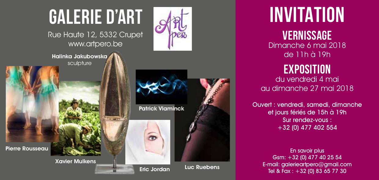 Exposition collective à laquelle nous avons le plaisir de retrouver les œuvres de la sculptrice Halinka Jakubowska. Autres artistes : Pierre Rousseau, Xavier Mulkens, Eric Jordan et Luc Ruebens. Ouvert : vendredi, samedi, dimanche et jours fériés de 15h à 19h. Juste pour vous annoncer cette merveilleuse exposition... Et pourquoi pas ........ !!! ?? un joli WE à CRUPET , les promenades - les restos - la grotte de Saint Antoine de Padoue et ......... bien évidemment La galerie « ArtPero » juste face à l'Église.