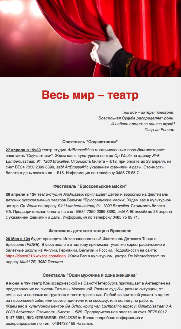 Приходите всей семьёй и зовите друзей! Продажа билетов начинается с 14 мая (только для Импульс) с 20 мая (для всех желающих) 0486 66 31 82 - Юлия / 0488 18 83 15 - Анастасия impuls.be at gmail.com