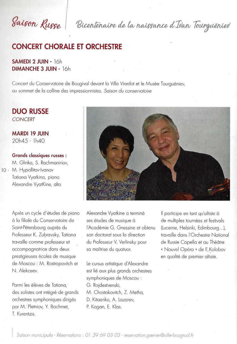 Saison russe : Bicentenaire de la naissance d'Ivan Tourguéniev. Ivan Tourguéniev, Homme de Paix Célébrations pour le bicentenaire de la naissance d'Ivan Tourguéniev (1818-1883) Samedi 2 juin et dimanche 3 juin – 16h, concert chorale et orchestre devant la villa Viardot et le musée Ivan Tourguéniev, saison du conservatoire Samedi 2 juin – à 20h45 / dimanche 3 juin - 16h, Sur la grand-route, théâtre, Cie Grains de scène, d’après Anton Tchékhov Mardi 19 juin – 20H45, Duo russe, musique, Tatiana Vyatkina et Alexandre Vyatkine