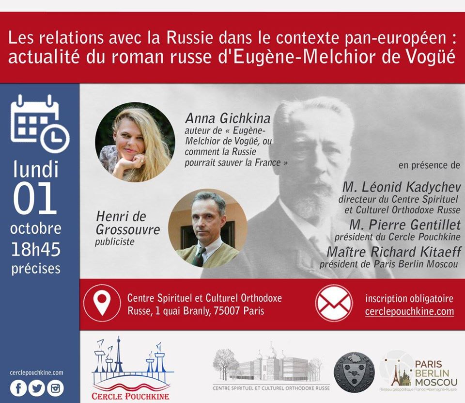 par Anna Gichkina (auteur) Anna Gichkina, auteur de "Eugène-Melchior de Vogüé, ou comment la Russie pourrait sauver la France" participe au colloque organisé par le Cercle Pouchkine au centre orthodoxe spirituel russe, intitulé : Les relations avec la Russie dans le contexte pan-européen. En présence d'Henri de Grossouvre, publiciste, de M. Léonid Kadychev, directeur du Centre Spirituel et Culturel Orthodoxe Russe et de Maître Richard Kitaeff, président de Paris-Berlin-Moscou.