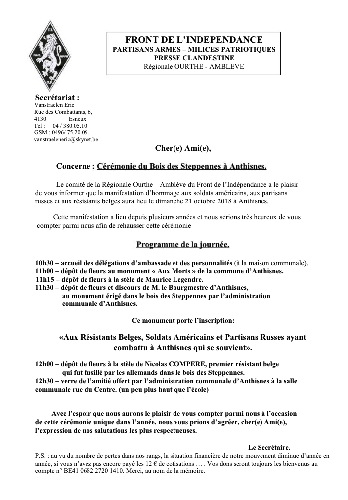 Paris, le 9 septembre 2018 Objet : Journée à la Mémoire du Mouvement Blanc Chers Amis, Nous espérons que vous avez passé de bonnes vacances et que vous êtes prêts à participer avec nous à la journée que nous organisons à la Mémoire du Mouvement Blanc dimanche 9 décembre 2018. Pour les nouveaux arrivés vous trouverez en lien ci-dessous un historique de la raison de cette journée ainsi que le programme. Quelques nouvelles : Nous avons créé pour une durée d'un an, l'association du « Centenaire du Mouvement Blanc ». Vous trouverez ci-contre l'affiche qui va véhiculer l'image de notre événement. Un dépliant a été réalisé et sera disponible aux endroits stratégiques (cathédrale, paroisses, mairies du 8e et de Boulogne, librairie Les Editeurs Réunis …) dès la semaine prochaine. Les mairies du 8e et de Boulogne ont accepté de diffuser l'information via leur journal de liaison. Le site Internet mouvementblanc.com devrait être visible fin septembre. Exposition : Comme nous vous l'avons annoncé, en plus de l'exposition de photos de chefs militaires et civils du Mouvement Blanc, de scènes de la Guerre Civile, d'images et de documents relatifs à la Croix Rouge Russe (l'ancienne organisation) et à l'épopée de Gallipoli, nous vous proposons d'exposer des photos et des documents d'hommes et de femmes méconnus (civils comme militaires) qui ont participé au Mouvement Blanc, dont vous êtes les descendants ou parents proches et que vous souhaiteriez présenter au public. Ce sera peut-être la dernière occasion de rendre hommage à ces personnes anonymes ou presque, qui au nom de la Russie libre ont sacrifié leur jeunesse, leur bien-être et souvent leur vie. A cet effet nous organisons une réunion le mardi 25 septembre à 18h30 à la cathédrale Saint- Alexandre-Nevsky, destinée à ceux qui souhaitent participer à cette partie de notre manifestation afin que nous puissions établir ensemble un code (couleur des panneaux, type et taille de police...) et ainsi donner une certaine homogénéité à l'exposition. Financement de l'événement : Pour que cette journée soit un succès nous pensons qu'elle doit être organisée au meilleur niveau. Le montant des dépenses (location de la tente, des chaises, chauffage) les conférences (hauts parleurs, régie, projecteurs), l'exposition (photos, grilles d'exposition, lumière) les animations, la publicité... est estimé à environ 10 000 €. Si vous considérez, comme nous, que cet événement est historique et que vous voulez nous aider à le réaliser, vous pouvez le faire en envoyant votre don par chèque à l'ordre du Centenaire du Mouvement Blanc ou par virement (RIB PJ 2). Un reçu fiscal donnant droit à une réduction d'impôt vous sera délivré. Si vous avez des questions, n'hésitez pas à nous écrire ou à nous téléphoner ! Hélène Bourlakoff, Secrétaire