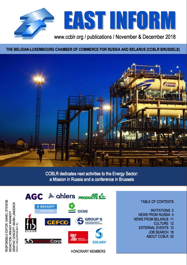 29 – 30 November 2018, Russia - Energy Sector Mission to the Russian Khanty-Mansi Autonomous Region — Yugra | Inside West Siberia. 11 December 2018, Brussels. Conference "Energy at the Edge of Innovation Scope 2040" News From Russia 4 News From Belarus 11 Culture 12 Exhibitions & External Events 13 17 October - 8 may 1919, Russia platform. CERISE lectures 22 November 2018, Belgium, Next session of the Import-Export Club: Russie, Belarus, Kazakhstan, Kirghizistan, Arménie 27 – 28 November 2018, Krasnogorsk (Moscow Region) 5th International Agricultural Dairy Forum 12 – 15 March 2019, Ufa (Russia), 29th International specialized exhibition "Agro Complex" World Expo 2025 Ekaterinburg, Russia. Changing the world : innovations and better life for future generations. Job Search 18 CCBLR Services / Staff 20 CCBLR Membership Application Form 21