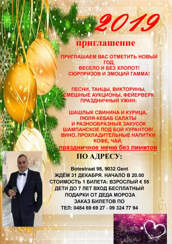 Openbaar · Georganiseerd door Новогодний бал. Состоится Новогодний банкет. В этом году мы подготовили для Вас банкетный зал класса премиум. С большой бесплатной парковкой. Гостей встречают в холле с бокалом шампанского, где они могут пообщаться и познакомиться друг с другом, в это время наш фотограф сделает для Вас снимки около Новогодней ёлки с Дедом морозом и Снегурочкой, которые потом можно будет скачать на нашем сайте. После сбора гостей мы приглашаем занять их свои места, столы пронумерованы и у каждого места будет именная табличка с именем гостя. Столы по 10 и 12 человек. Для вас работает команда поваров и официантов, каждый стол будет накрыт к приходу гостей, что бы гости могли себя максимально комфортно чувствовать, а не отстаивать очереди в буфете. Холодный стол состоит из 9 холодных закусок и всеми нами любимых салатов, таких как салат Оливье, селедка под шубой, мясная нарезка, овощное ассорти, сырная тарелка, соленья, овощные салаты, куриные крылышки, фаршированные блинчики, копченый лосось, хлеб, масло, соусы. Так же будет предложено 2 горячих, которое будет подаваться так же на столы. На десерт мы предлагаем наш фирменный торт, включены все прохладительные напитки, бутылка вина на 2 человек. Мы встречаем наших гостей бокалом шампанского, а так же для каждого - бокал шампанского под бой курантов! (Гости могут принести с собой 1 бутылку элитного алкоголя на свой вкус, это не возбраняется). Позвольте Вам представить Вокально - инструментальную группу «Старый двор», которая также известна в Бельгии и Голландии как «The Culture Kings» . Репертуар группы широк и разнообразен. Они виртуозно играют классику, jazz, blues, pop музыку, шлягеры, а так же все известные мировые эстрадные хиты на русском, французском, английском языках. Руководитель группы : Игорь Беер окончил Одесскую консерваторию по классу скрипки, а так же Джаз студию Антверпен. Виртуозно играет на фортепиано, скрипке, гитаре, аккордеоне и бас-гитаре, синтезатор. В Бельгии работал в составе групп : Little Rock & Axel, Harley Blues band, Eighty-one 81, The Culture Kings. Несколько лет он играл на международных круизных лайнерах. Помимо музыкальной карьеры он занимается преподавательской деятельностью, обучает игре на гитаре и фортепиано детей и взрослых. Тел. 0488 98.04.08 Армен Бекназарян, окончил Ереванскую консерваторию по классу скрипки. Помимо участия в ансамбле, он также играет в симфоническом оркестре в Бельгии. Ранее он играл в государственном симфоническом оркестре Армении, с которым они неоднократно выступали на телевидении и участвовал в международных гастролях. Leo Verstrepen, бельгиец, обучался джазу и классической музыке в Бельгии. Играет на кларнете и тенор-саксофоне. Раньше он выступал в различных джазовых, дикси и блюзовых группах. Хорошо знает и любит русскую культуру и музыку. Здесь (нить ниже )можно послушать альбом группы «Старый двор». Но это еще не все! После 00:00 2019 года Вас ждет зажигательная дискотека, ведёт которую DJ Bartje, В его распоряжении «длинный свет», лазеры, что бы сделать световое шоу незабываемым.