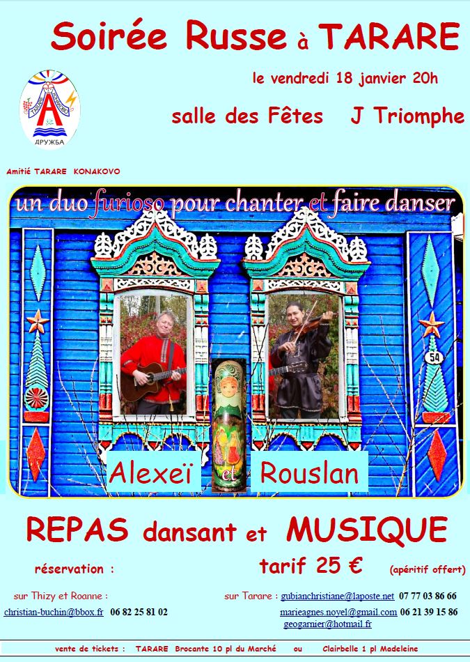 Le tarif est fixé à 55 € par personne (repas et boissons comprises) Les places sont limitées, réservez absolument avant le 31 Décembre 2018 en envoyant un chèque d’acompte de 30€ par personne en précisant le nom, le nombre de personnes, et un moyen de vous joindre en cas de changement (mail ou téléphone). Notre adresse : Association Slavyanochka, rue des Violettes 6, F-27000 EVREUX Pour tous renseignements, contactez-nous au 02.32.31.26.96 ou par courriel à association.slavyanochka at gmail.com