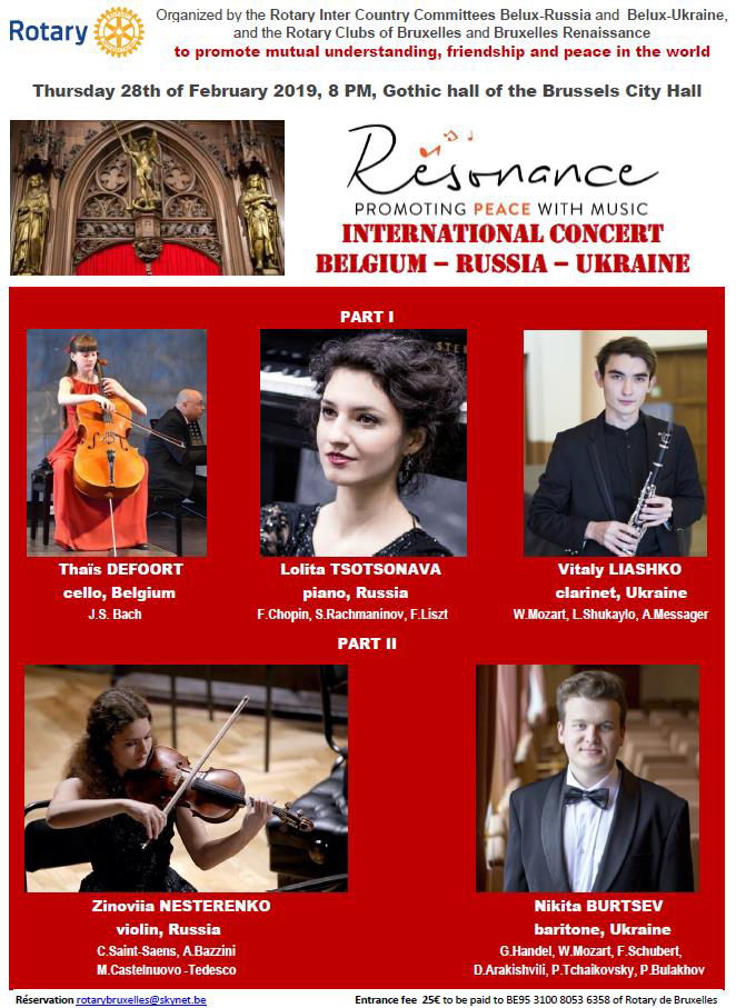 Promoting peace with music. Organized by the Rotary Inter Country Commitees Belux-Russia and Belux-Ukraine, and the Rotary Clubs of Bruxelles Renaissance to promote mutual understanding, friendship and peace in the world. Chères Amies, Chers Amis, Madame, Monsieur, Ne manquez pas de participer à ce concert unique au bénéfice des oeuvres soutenues par nos 2 Clubs Rotary Bruxelles et Bruxelles-Renaissance, - réunissant de jeunes prodiges Belges, Russes & Ukrainiens - dans la célèbre Salle Gothique de l'Hôtel de Ville de Bruxelles - le jeudi 28 février à 20h précise accueil à 19h30. N'attendez pas, le nombre de places est limité à 250 places à 25€*. N'hésitez pas à le faire savoir à vos familles, amis et relations ! Je vous souhaite une année 2019 sans soucis ! Programme : Part I Thaïs Defoort, cello, Belgium (J. S. Bach) Lolita Tsotsonava, piano, Russia (F. Chopin, S. Rachmaninov, F. Liszt) Vitaly Liashko, clarinet, Ukraine (W. Mozart, L.Shulkaylo, A. Messager) Part II Zinoviia Nesterenko, violin, Russia (C. Saint-saens, A Bazzini, M. Castelnuovo-Tedesco) Nikita Burtsev, baritone, Ukraine (G. Handel, W. Mozart, F. Schubert, D. Arakishvili, P. Tchaikovsky, P. Bulakhov)